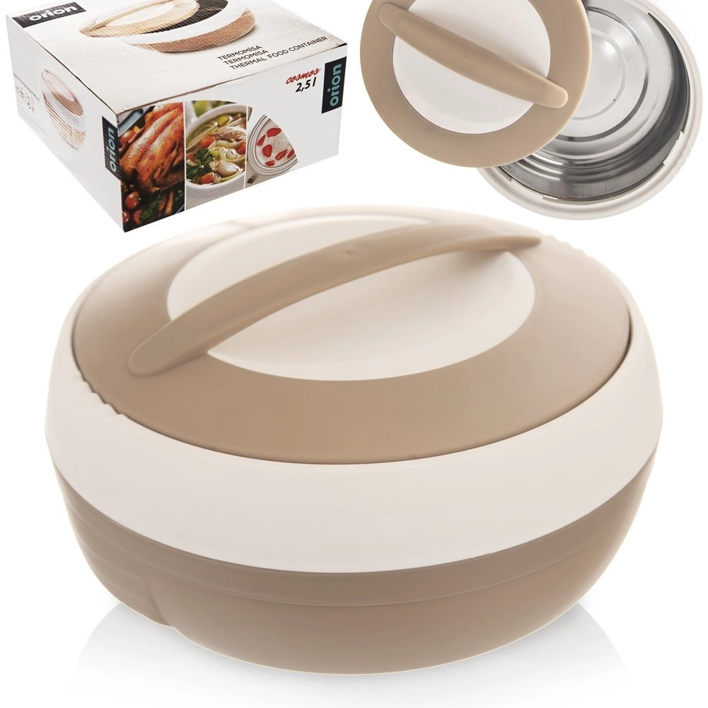 Praktična termoposuda zapremnine 2,5 l za čuvanje toplih i hladnih jela. Zahvaljujući unutarnjem sloju od nehrđajućeg čelika i jednostavnom zatvaranju poklopcem s ručkom, hranu održava toplom do 2 sata. Laganа, izdržljivа i idealnа za prenošenje ručkova, juha i deserata. Originalni proizvod marke ORION.