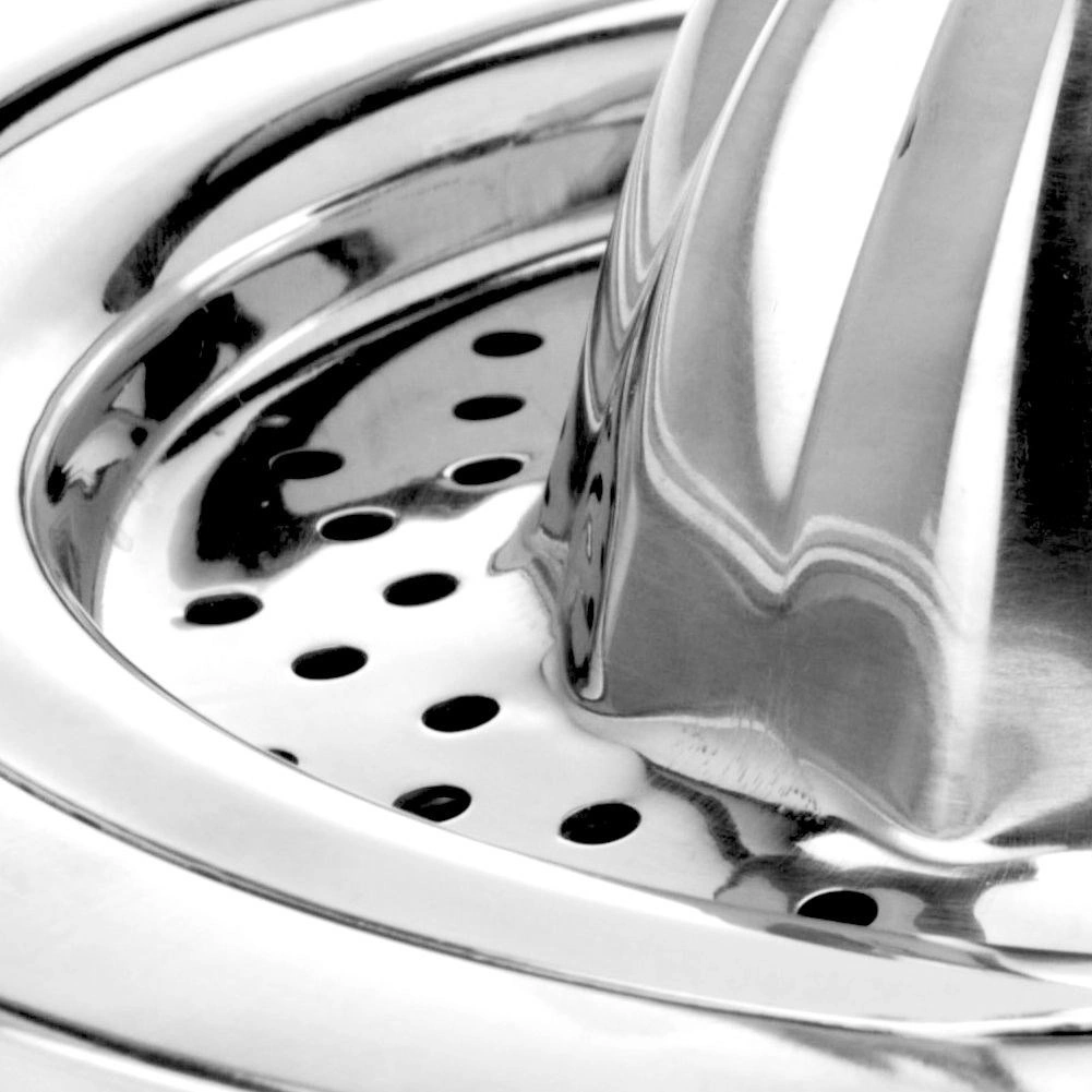 Praktični inox sokovnik za agrume s integriranim sitom i sabirnom posudom omogućuje vam cijeđenje soka izravno u posudicu. Robusna izvedba od kvalitetnog nehrđajućeg čelika je sigurna za kontakt s hranom, otporna na koroziju i jednostavna za čišćenje, uključujući mogućnost pranja u perilici.