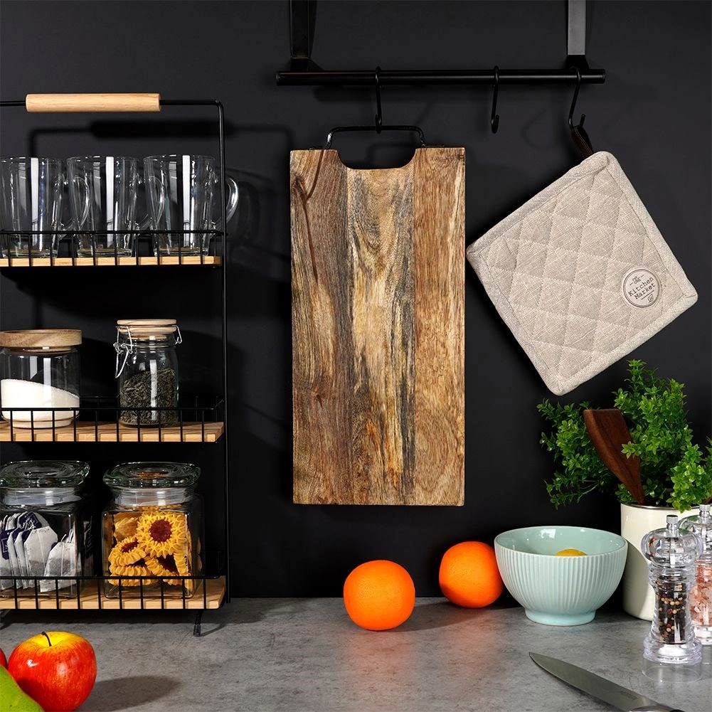 Robusna crna ručka olakšava prenošenje i vješanje na kuhinjsku šipku – daska je uvijek pri ruci i dobro se suši.