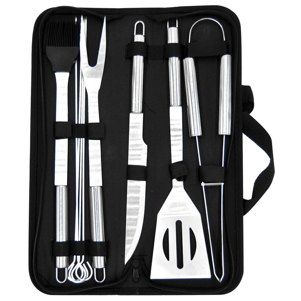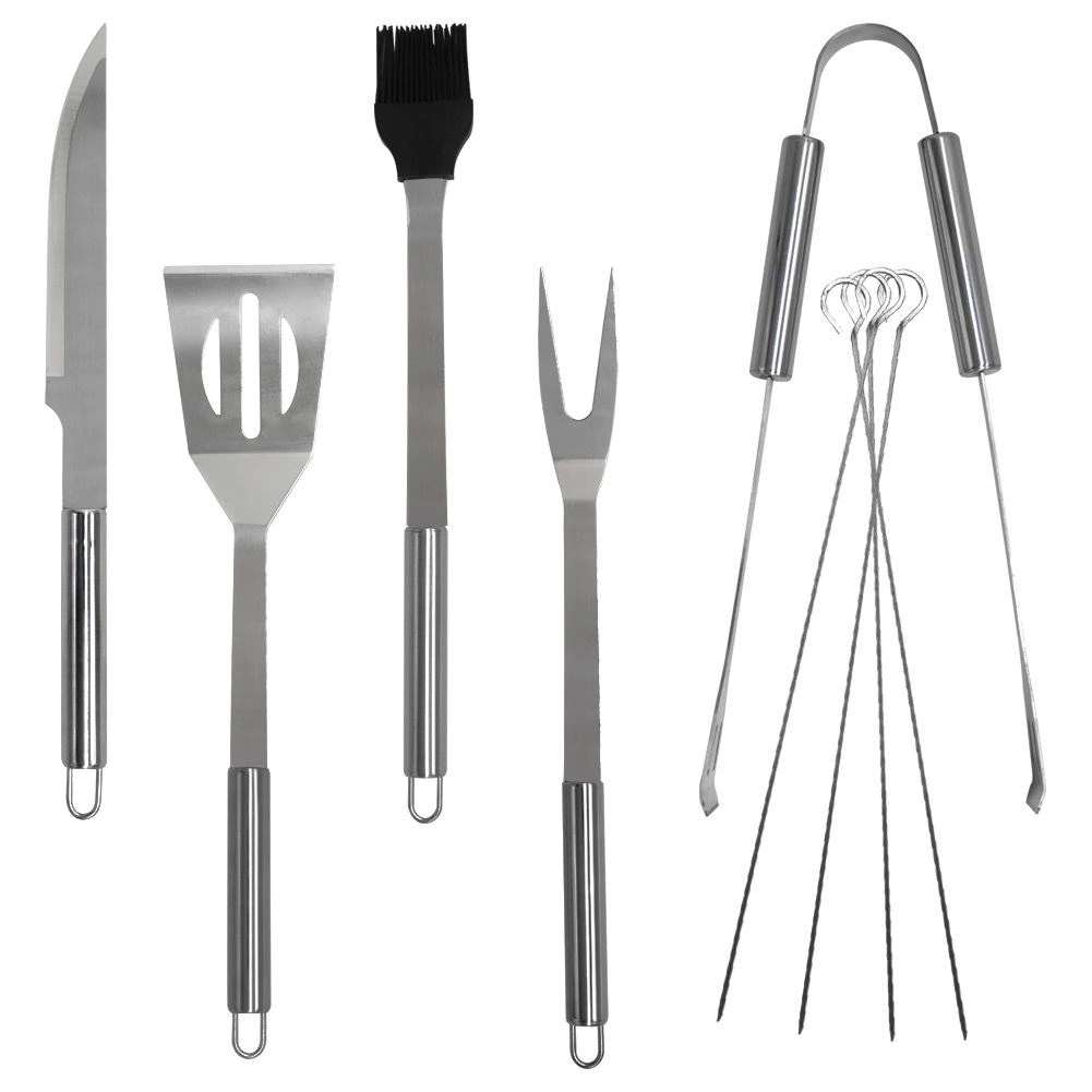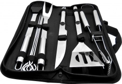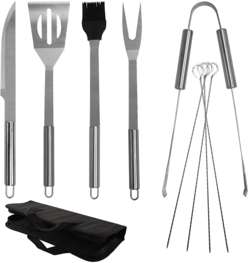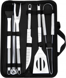 Ovaj univerzalni set od 10 dijelova pokriva sve potrebe uz roštilj i u kuhinji. U pakiranju se nalazi lopatica s oštrim rubom za lako rezanje izravno na rešetki, vilica, kliješta, nož, kist i 4 ražnjića za meso ili povrće. Sve je pohranjeno u tekstilnom etuiju s patentnim zatvaračem i ručkom za prenošenje i preglednu organizaciju.