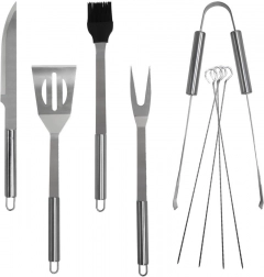 Lopatica s oštrim rubom, vilica, kliješta, nož, kist i 4 ražnjića – sve što trebate za pripremu i posluživanje na roštilju.