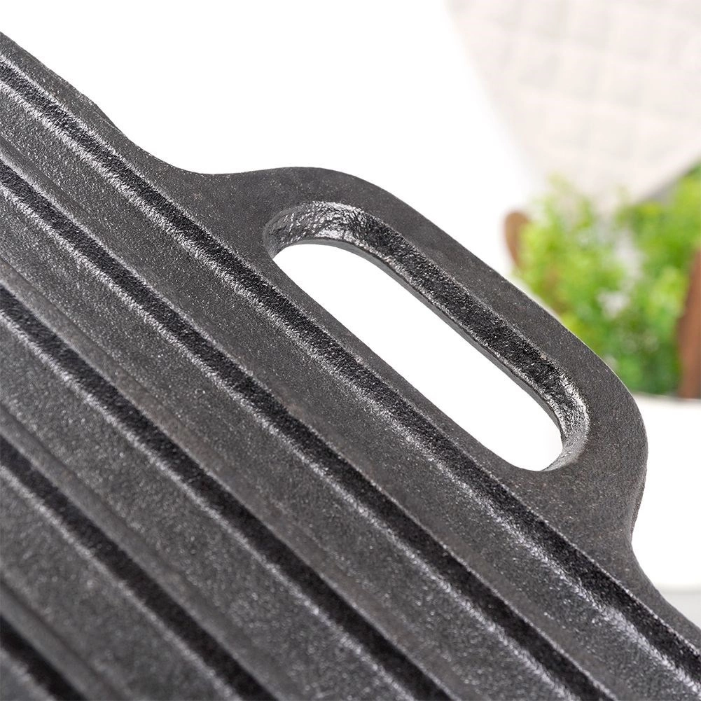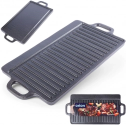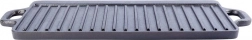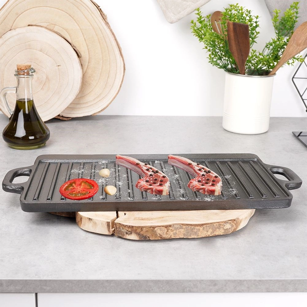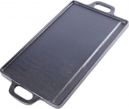 Robusna lijevana ploča dimenzija 45,5 × 23 × 1,5 cm nudi dvije radne površine: glatku za prženje, pečenje i grill bez otisaka te rebrastu za izraženu mrežicu i odvod viška masnoće. Zahvaljujući visokoj akumulaciji topline postižete ravnomjerno pečenje i izvrstan okus kao s vanjskog roštilja.
