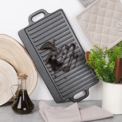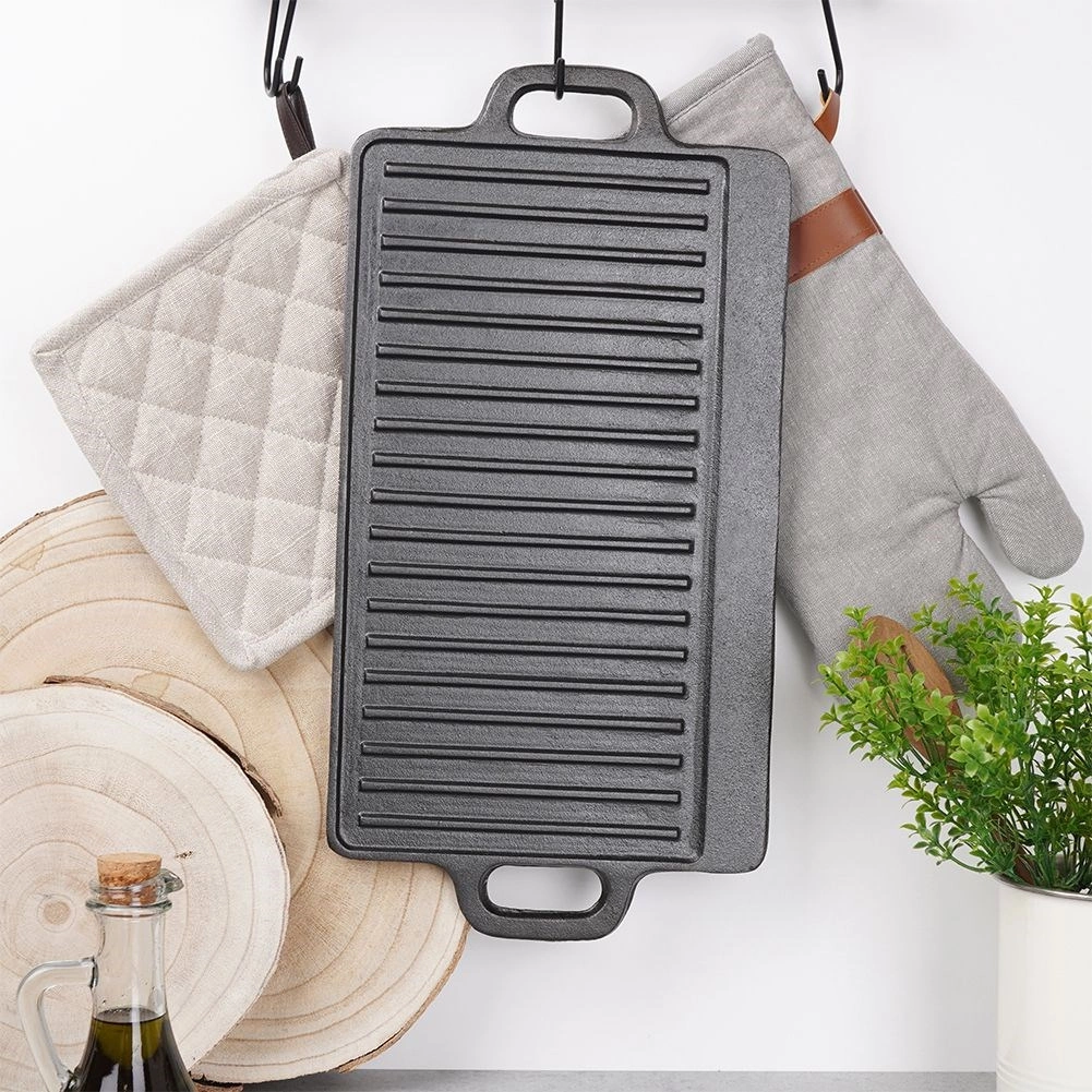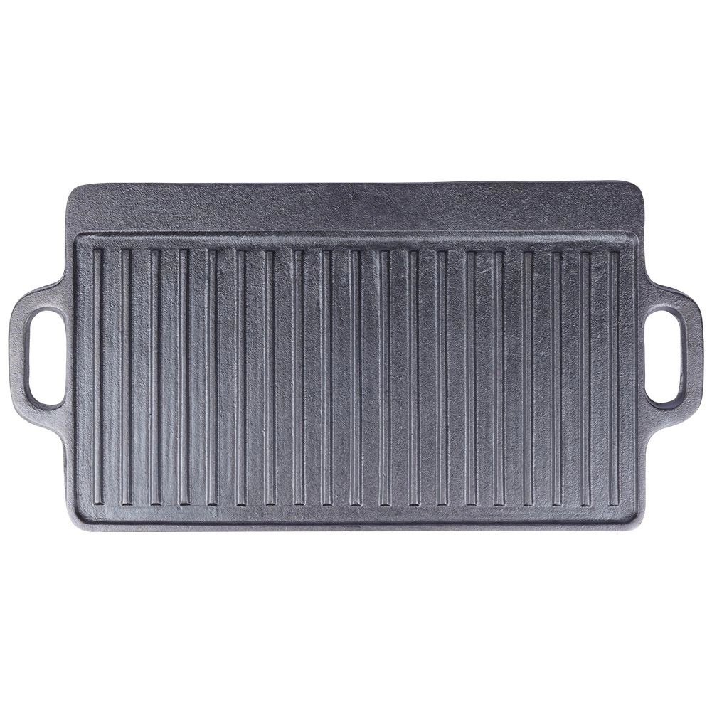 Univerzalna lijevana grill ploča za savršene odreske, ribu i povrće. Zahvaljujući obostranom dizajnu – glatka i rebrasta strana – pripremit ćete sve od palačinki do sočnih odrezaka. Lijevano tijelo izvrsno provodi i zadržava toplinu, izdržljivo je i prikladno za štednjak, pećnicu, roštilj i otvorenu vatru, uključujući indukciju.