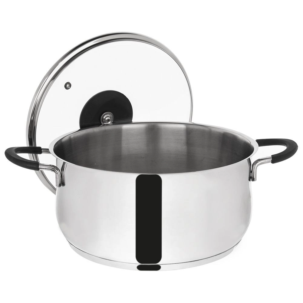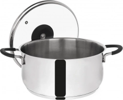 Premium inox lonac DALIE promjera 24 cm i zapremine 5,3 l sa staklenim poklopcem idealan je za svakodnevno kuhanje i pirjanje. Izrađen od kvalitetnog nehrđajućeg čelika 18/10, s višeslojnim akutermičkim dnom za ravnomjernu raspodjelu topline i uštedu energije. Ergonomične ručke sa silikonom ne zagrijavaju se tijekom kuhanja, a poklopac ima otvor za ispuštanje pare. Pogodan za sve vrste štednjaka, uključujući indukciju, kao i za pećnicu (bez poklopca) te je lako periv i u perilici posuđa.