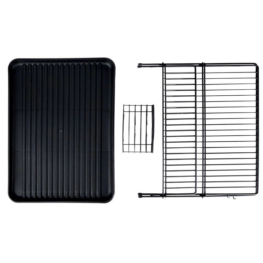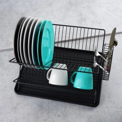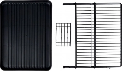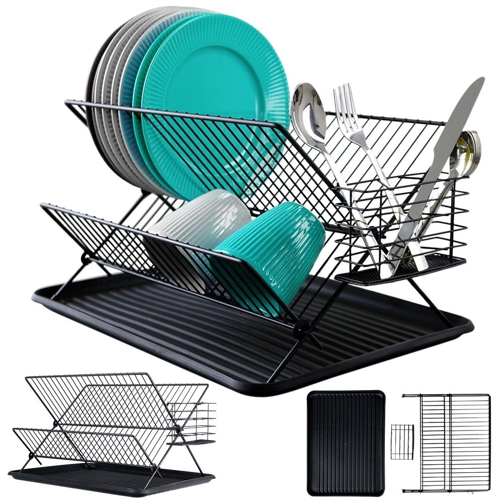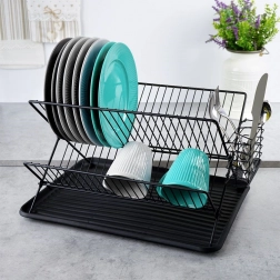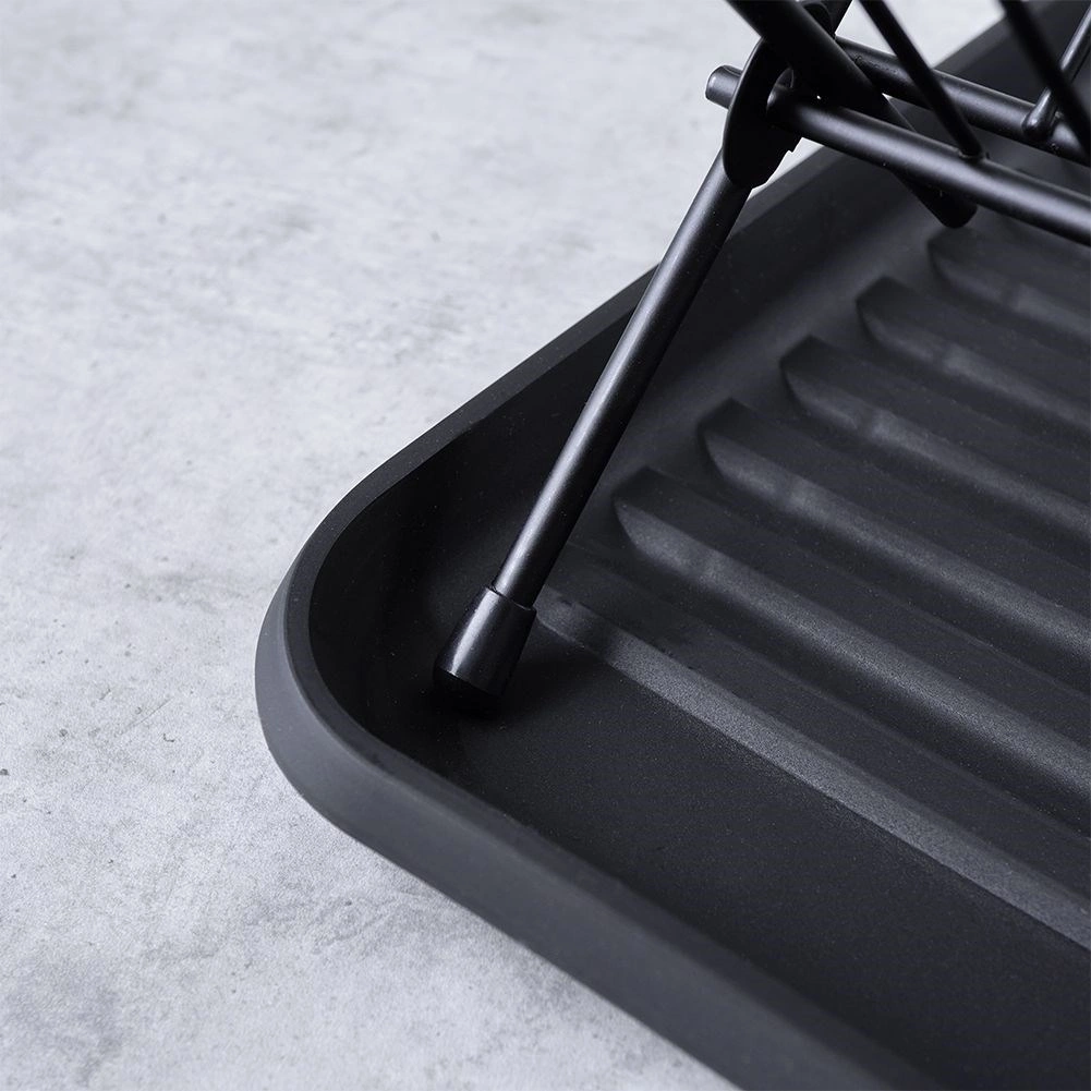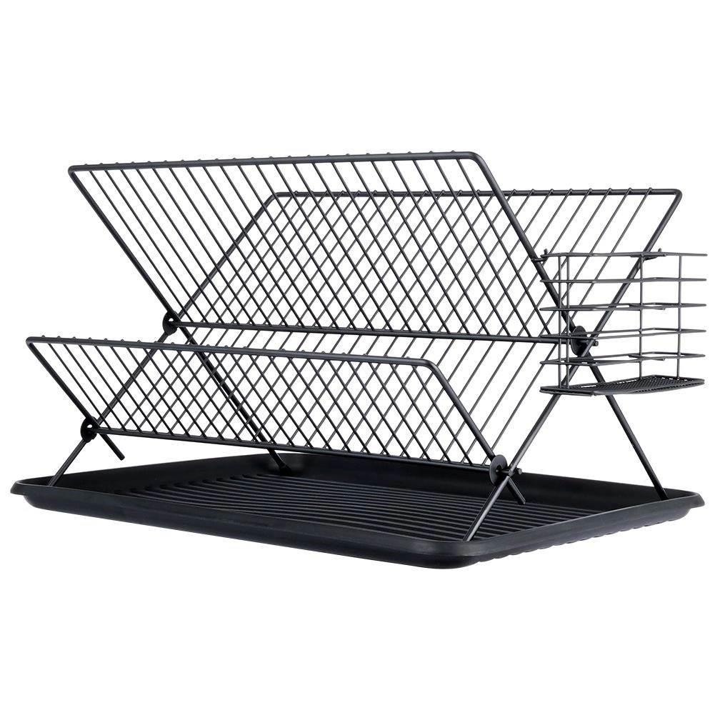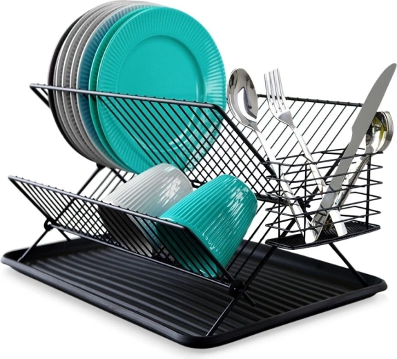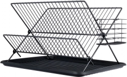 Ocjeđivač je izrađen od izdržljivog metala u elegantnoj crnoj boji, ima protuklizne nožice za stabilnost i izvadivu plastičnu kadicu za lako izlijevanje vode i čišćenje. Sklopiva konstrukcija štedi prostor kada vam nije potrebna puna kapacitet.