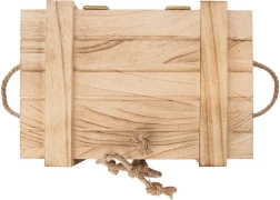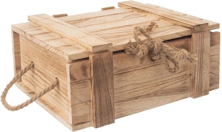 Stilska drvena kutija s poklopcem dimenzija 30 × 21 × 12 cm idealna je za pohranu sitnica i darovno pakiranje. Ima čvrstu konstrukciju, bočne užad za lako nošenje i poklopac s vezanjem od jutene špage. Prirodno drvo, praktično zatvaranje i univerzalna primjena u kućanstvu, radionici i uredu.