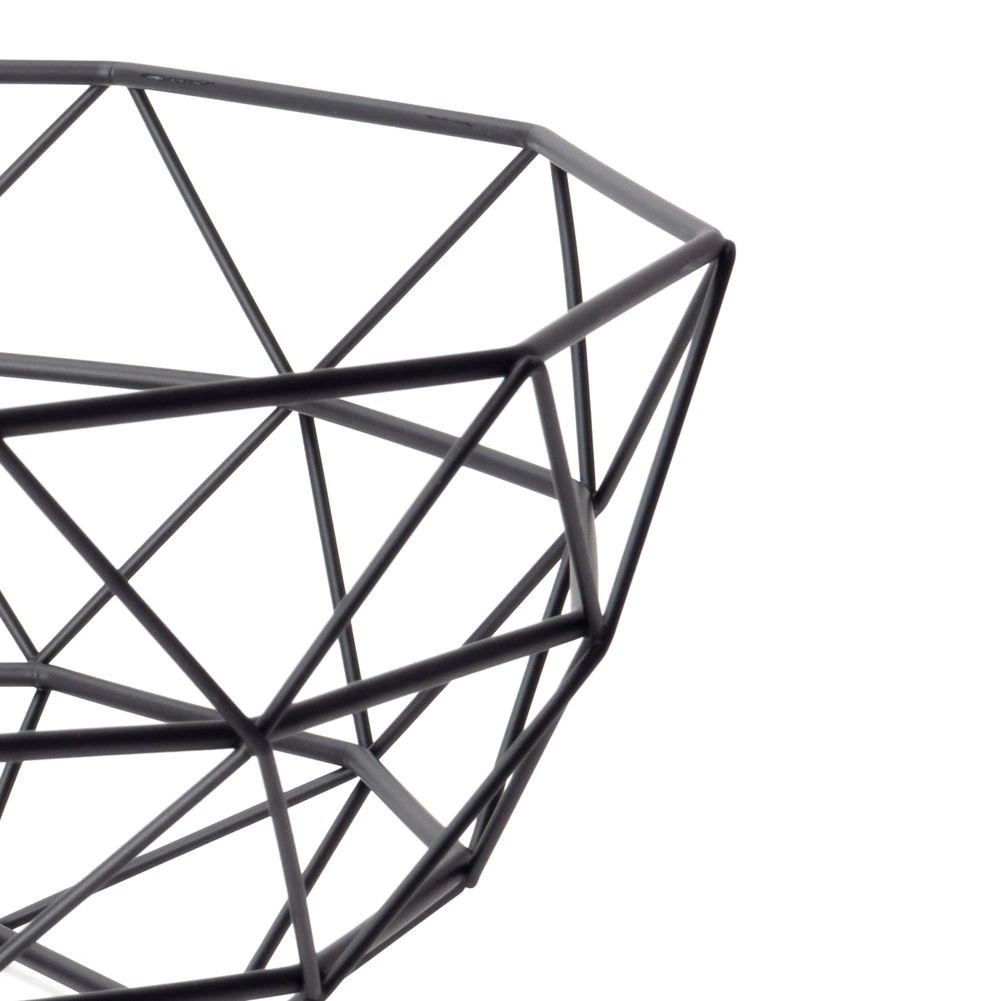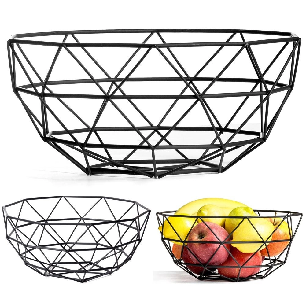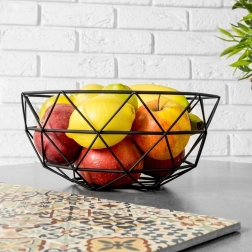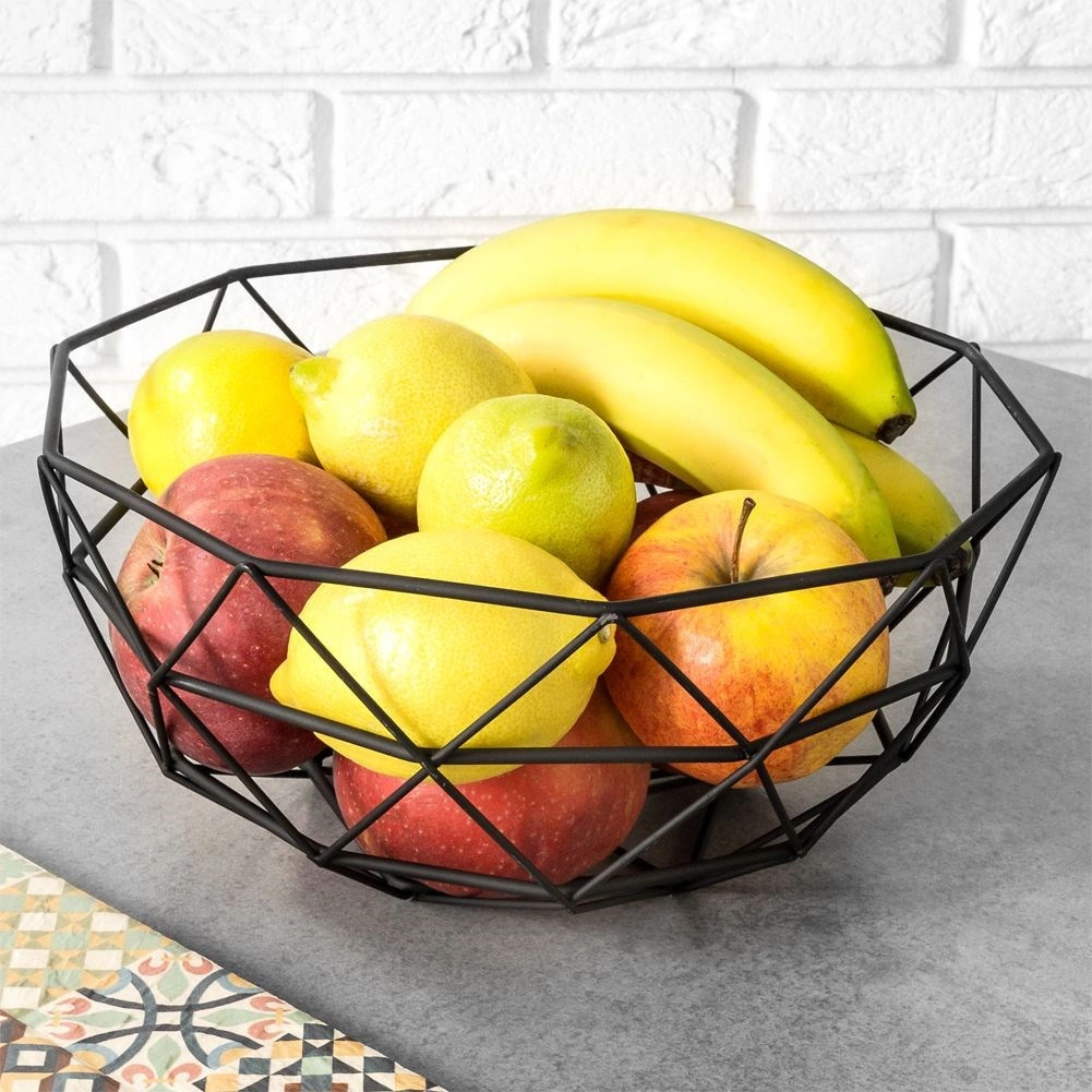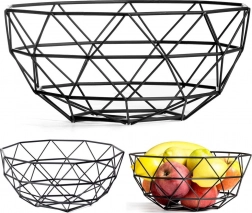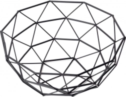 Ova dekorativna zdjela za voće spaja elegantan izgled s praktičnom uporabom. Mat crna metalna izvedba i poligonalna žičana konstrukcija osiguravaju izdržljivost, stabilnost i optimalnu cirkulaciju zraka, pa voće i peciva ostaju duže svježi. Zahvaljujući minimalističkom izgledu idealna je kao središnji element blagovaonskog stola ili dizajnerski dodatak na kuhinjskoj radnoj plohi.