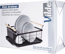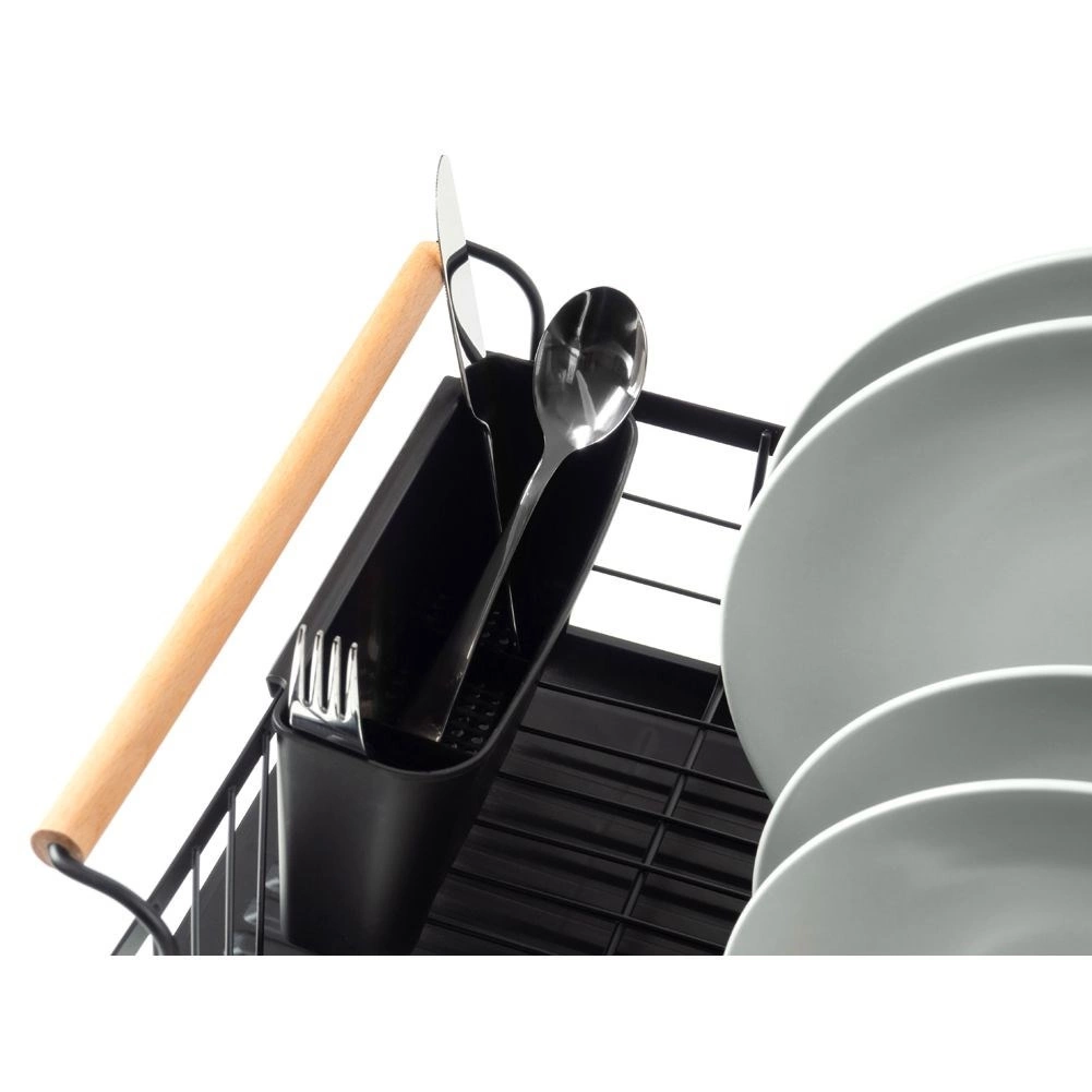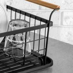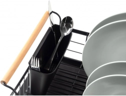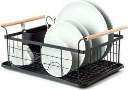 Elegantni i funkcionalni ocjeđivač od crno lakiranog metala spaja visoku izdržljivost s praktičnim detaljima za udobno sušenje tanjura, čaša i pribora. Žljebljena posuda za ocjeđivanje skuplja vodu i štiti radnu plohu, dok izvlačiva košarica za pribor osigurava urednost i brzo sušenje.