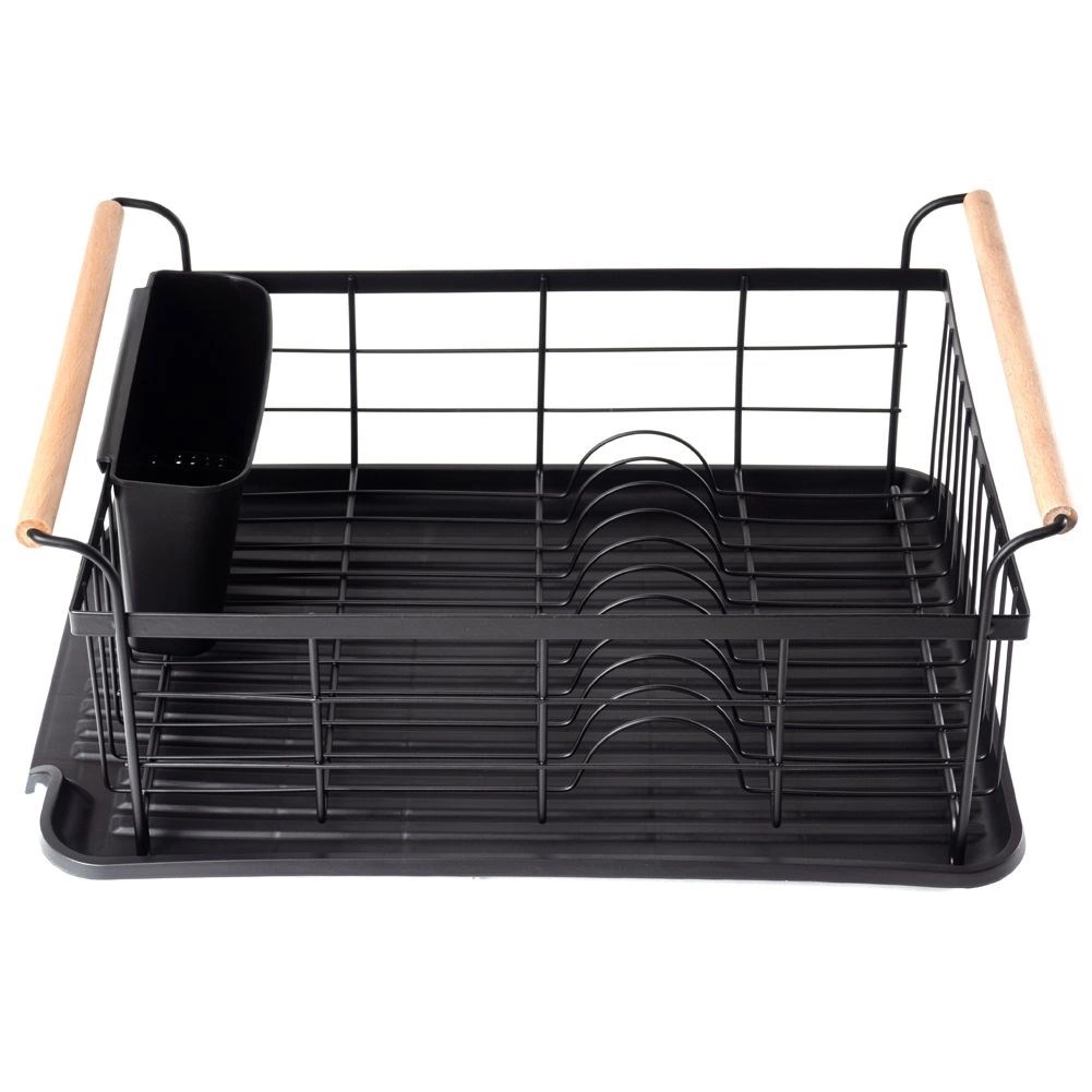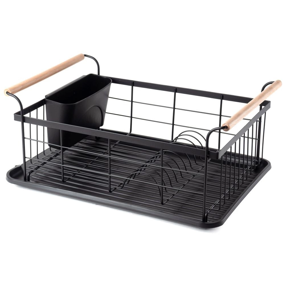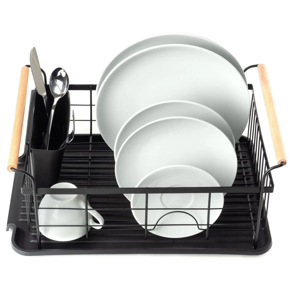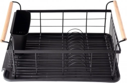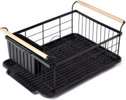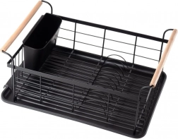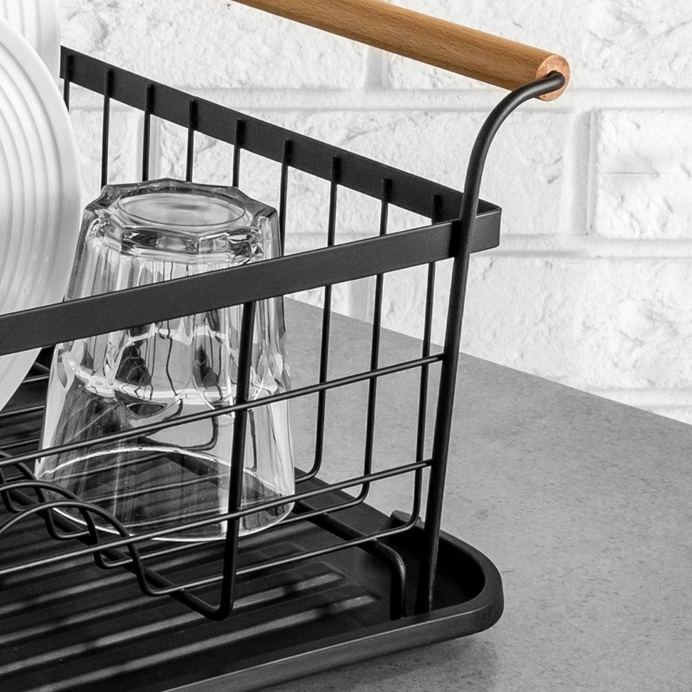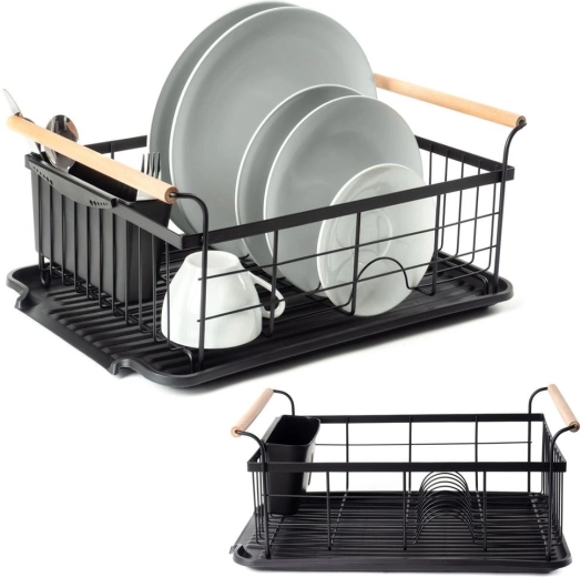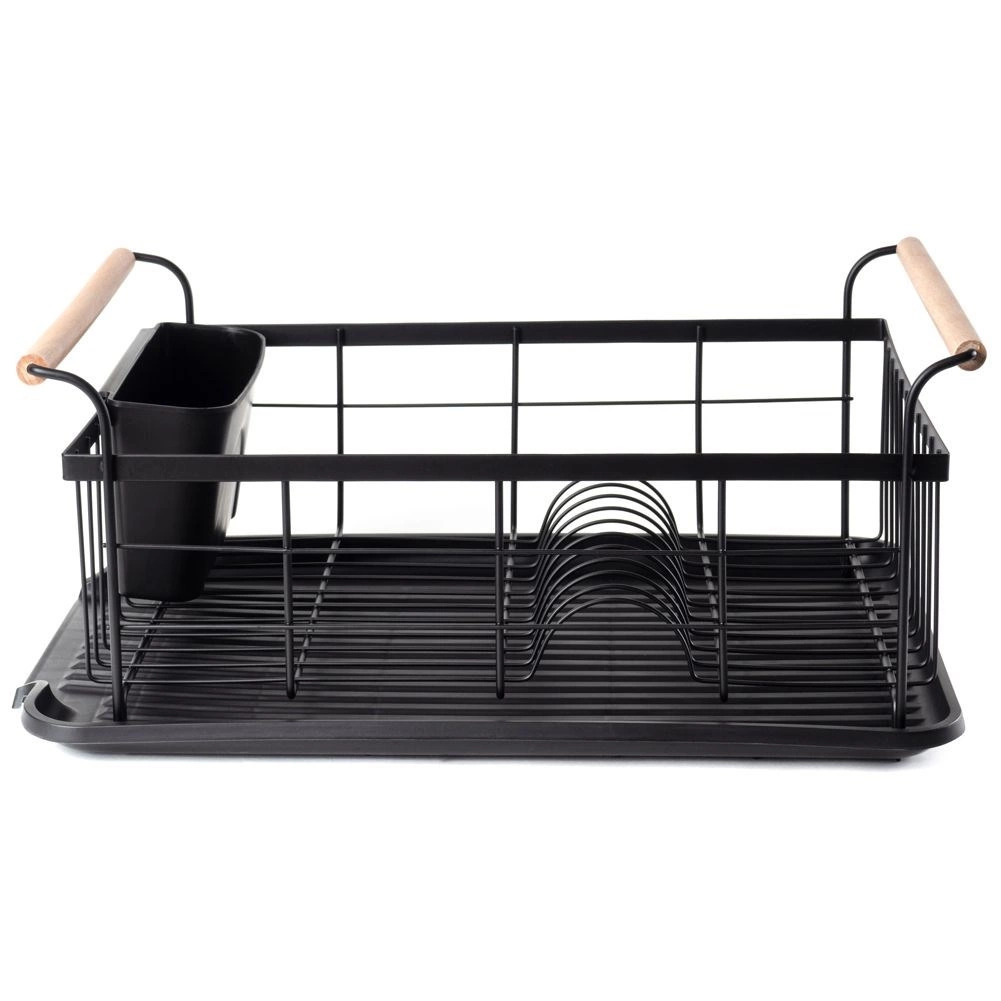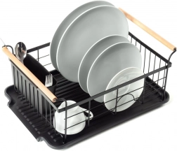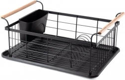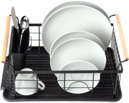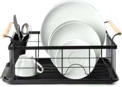Izdržljiv crni metal s preciznim zavarima sigurno drži tanjure i čaše na mjestu, dok rebrasta posuda učinkovito odvodi vodu.