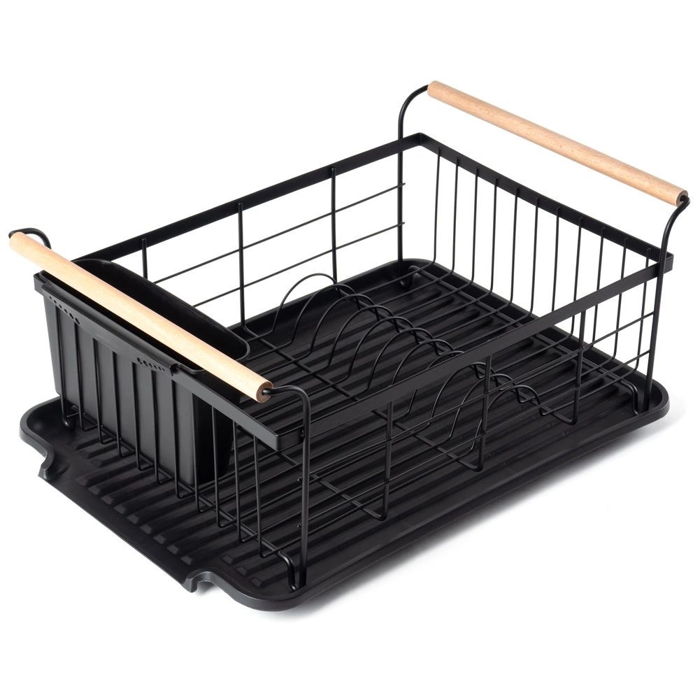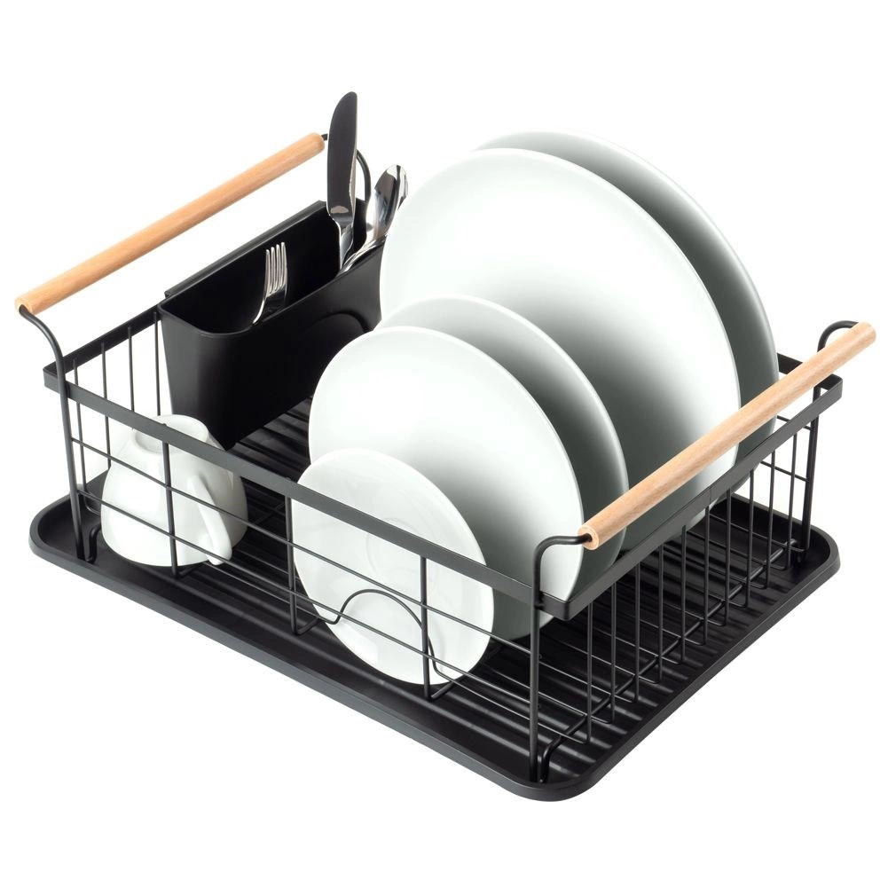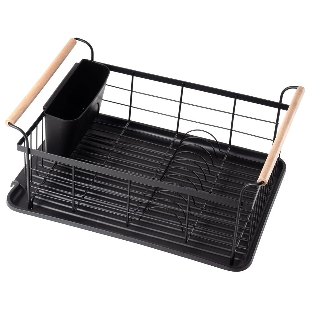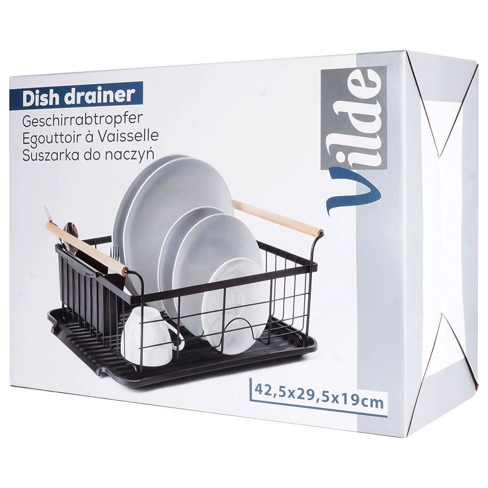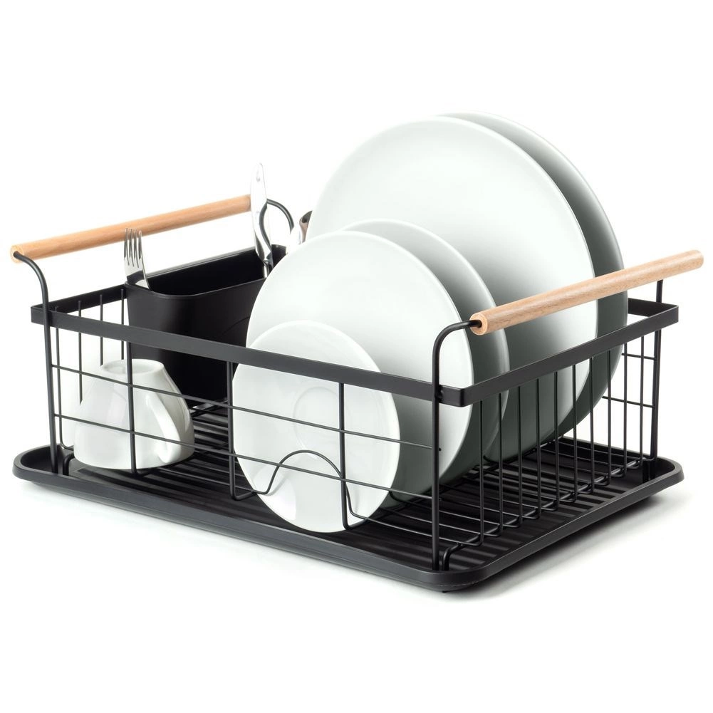 Izdržljiv crni metal s preciznim zavarima sigurno drži tanjure i čaše na mjestu, dok rebrasta posuda učinkovito odvodi vodu.