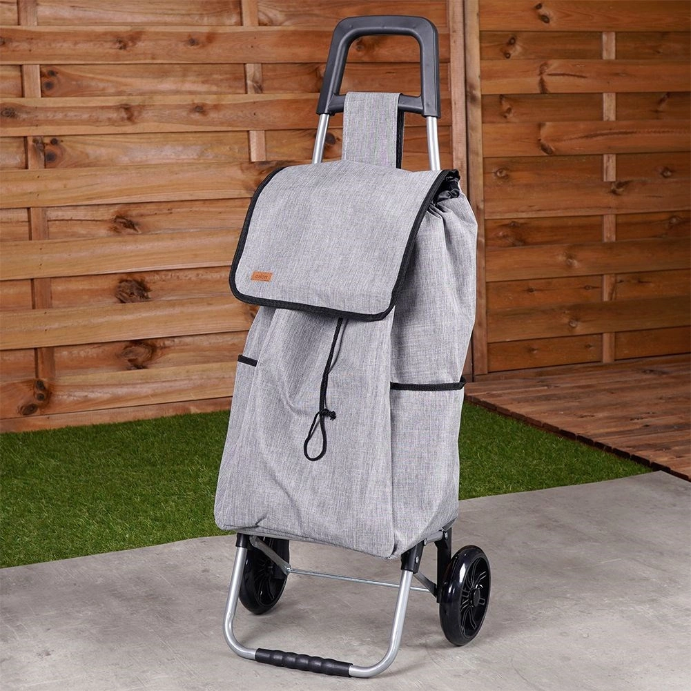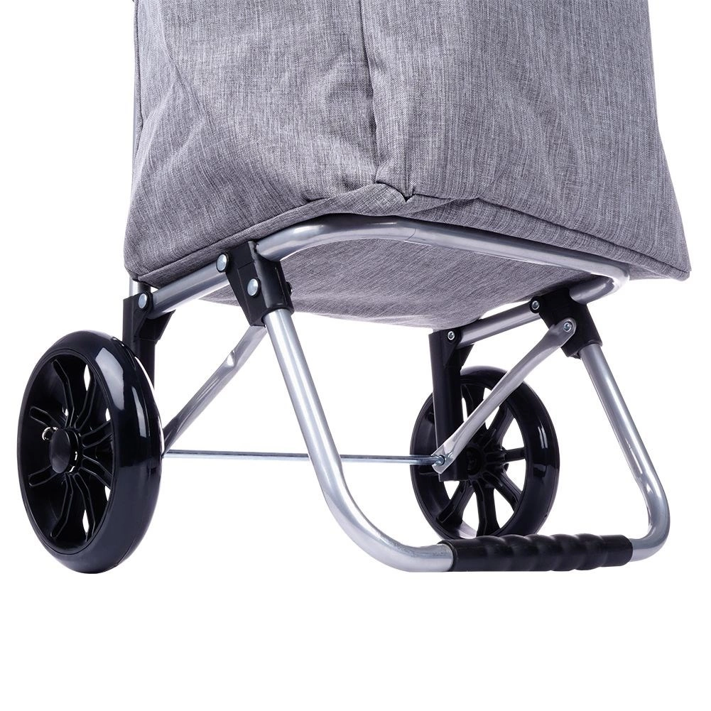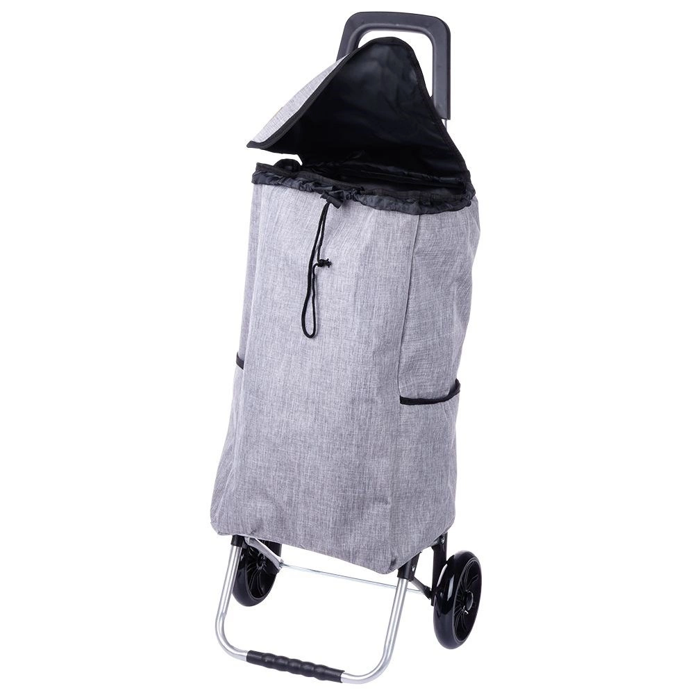Kolica za kupnju sa sivom tekstilnom torbom dizajnirana su za udoban i siguran prijevoz kupovine. Lagani, ali izdržljivi metalni okvir s dvama velikim plastičnim kotačima osigurava stabilnost i glatko kretanje. Torba je zaštićena preklopom i zatvara se povlačnom uzicom, pa sadržaj ostaje na sigurnom i pri lošijem vremenu.