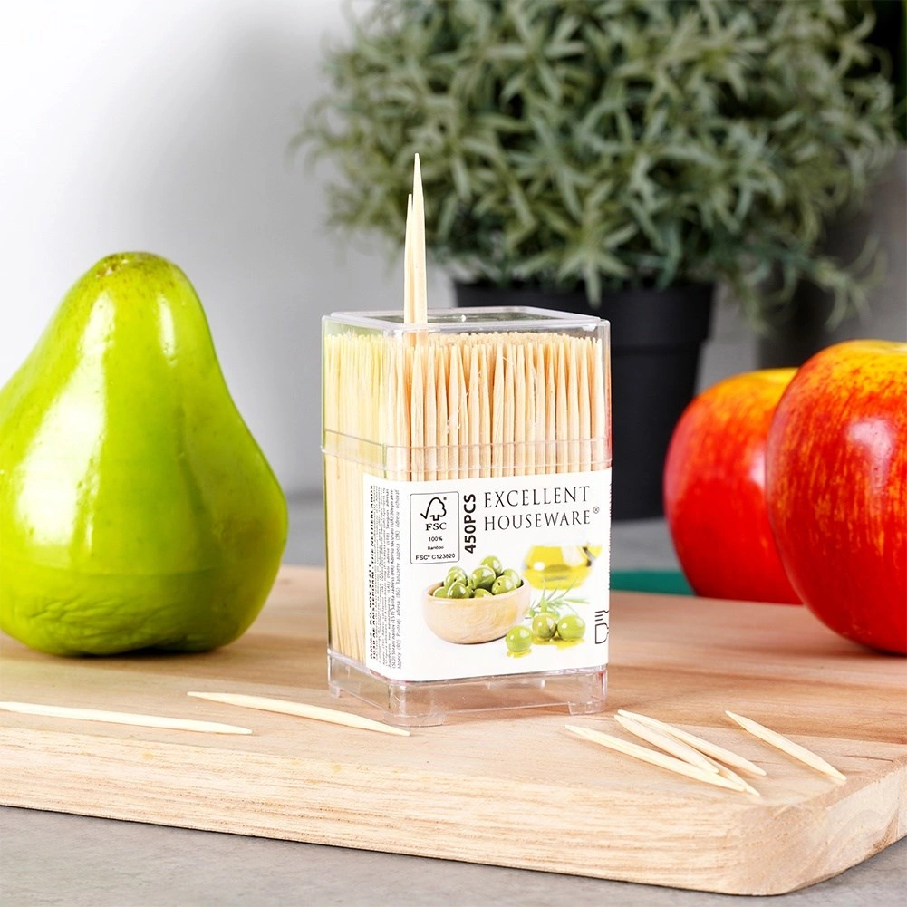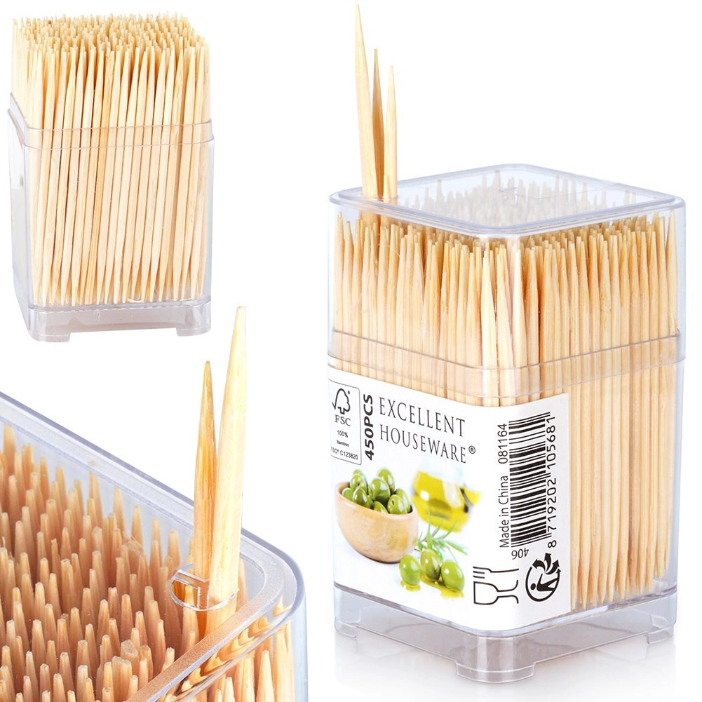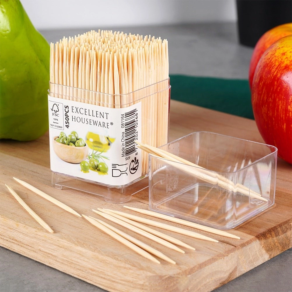 Elegantno i higijensko rješenje za svaku priliku: ovaj set 450 bambusovih čačkalica u prozirnoj kutijici olakšava posluživanje osvježenja i svakodnevnu njegu nakon jela. Prirodni bambus je čvrst, gladak i izdržljiv, pa se čačkalice ne lome i ugodne su za upotrebu.