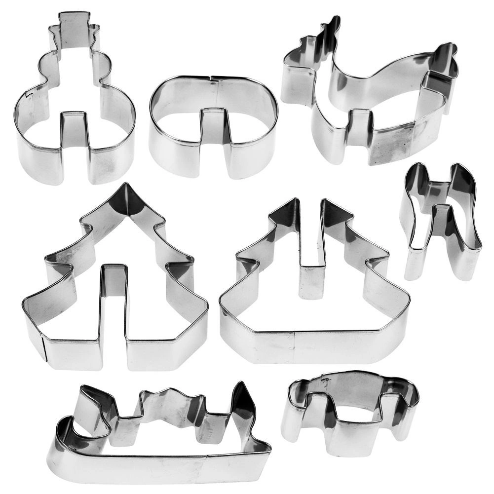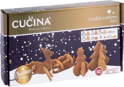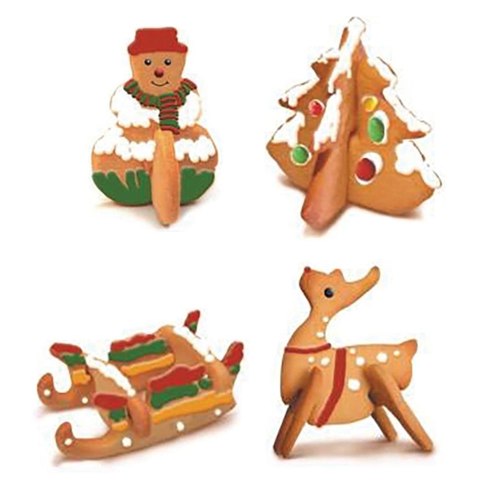 Set sadrži 8 komada za pripremu 4 različita 3D motiva: božićno drvce, snjegović, sob i saonice. Dimenzije pojedinih dijelova su približno u širini 4,5–9,5 cm i duljini 3,5–8,5 cm. Kalupi su univerzalni – pogodni i za fondant ili modelirajuće mase za ukrašavanje torti i deserata.