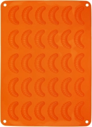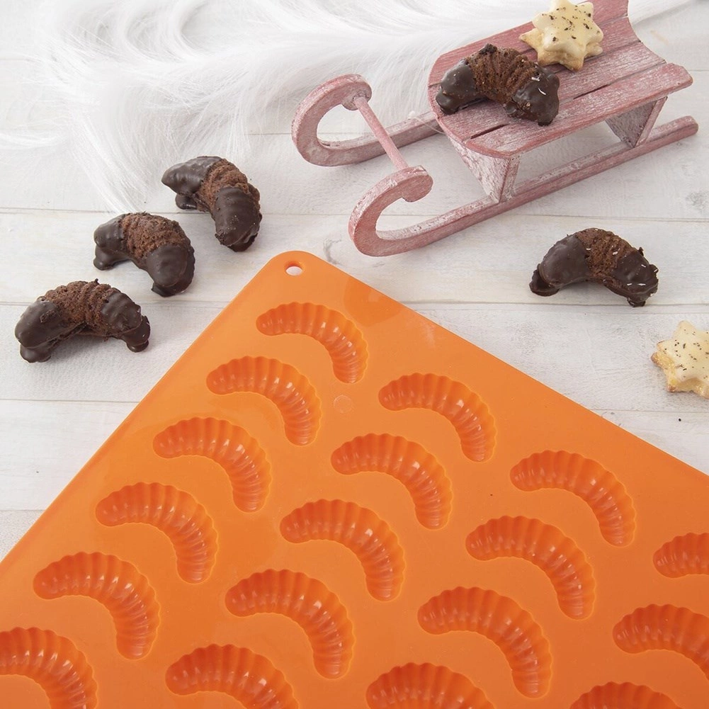Ovaj narančasti silikonski kalup Sillinie idealan je za jednostavnu pripremu kolačića, čokoladica i pralina u obliku kiflica. Zahvaljujući neljepljivoj površini tijesto se ne lijepi, a gotovi komadi se lako vade bez potrebe za premazivanjem ili posipavanjem.