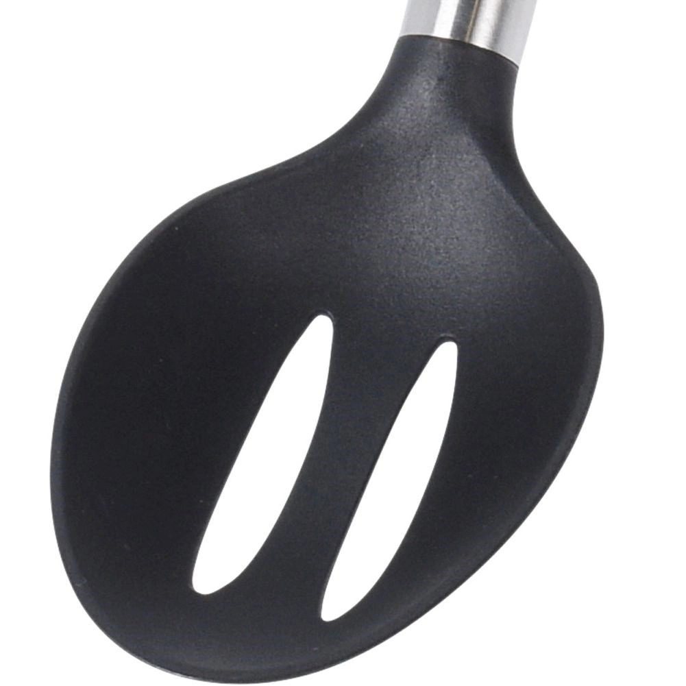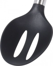Ova kuhinjska žlica s otvorima idealna je za svakodnevno kuhanje. Najlonski radni dio je čvrst, otporan na trošenje i siguran za tave s neljepljivim premazom – neće izgrebati teflon, keramiku ni staklo. Zahvaljujući toplinski otpornom materijalu do 210 °C bez brige miješajte i vruća jela.