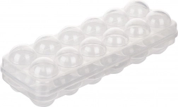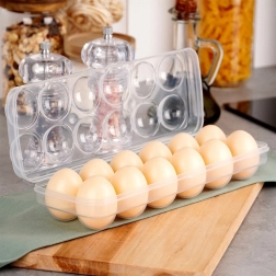 Posebno oblikovana mjesta čvrsto drže svako jaje na svom položaju, dok čvrst poklopac s kopčom sprječava neželjeno otvaranje pri rukovanju. Kutija je lagana, višekratno upotrebljiva i izvrsna za kupnju na tržnici, za hladnjak i zamrzivač.