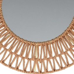 Ovo okruglo zidno ogledalo dizajnerski je dodatak u prirodnom stilu. Okvir od pletenog papira na čvrstoj metalnoj konstrukciji stvara efektnu strukturu koja se ističe u interijerima u duhu boho, skandinavskog ili modernog minimalizma. Neutralni beživo-sivi tonovi lako se kombiniraju s različitim bojama i materijalima.