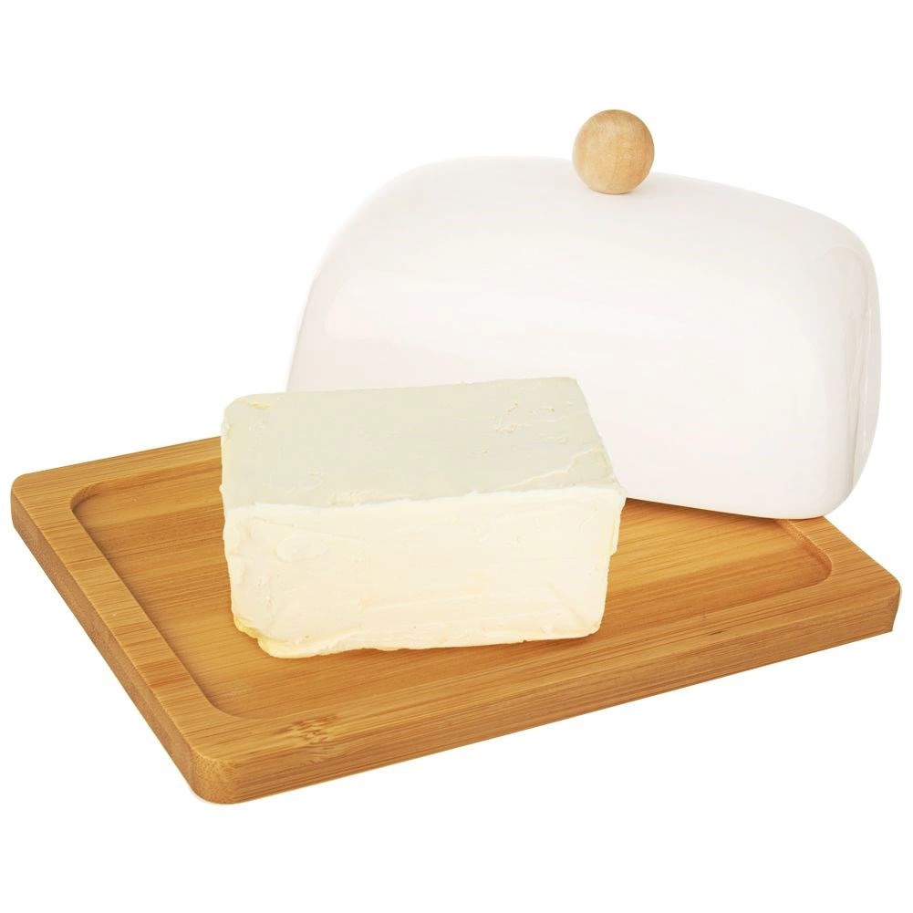 Otkrijte spoj bezvremenskog dizajna i funkcionalnosti. Porculanski poklopac u bijeloj boji sjajno se slaže s prirodnim bambusovim pladnjem s urezanim rubom za stabilno postavljanje. Maslenka je idealna i za hladnjak i za stol – održava maslac svježim, zaštićenim od isušivanja i nepoželjnih mirisa.