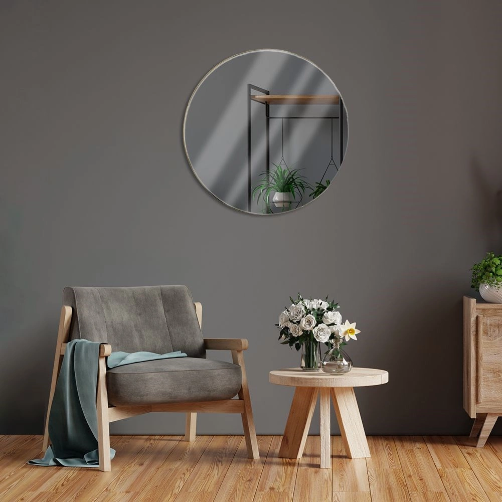 Elegantno zidno ogledalo u modernoj zlatnoj izvedbi univerzalna je dekoracija za svaki interijer. Zahvaljujući promjeru od 55 cm i tankom okviru djeluje prozračno, naglašava stil prostorije i ujedno je praktičan pomoćnik za svakodnevnu upotrebu.