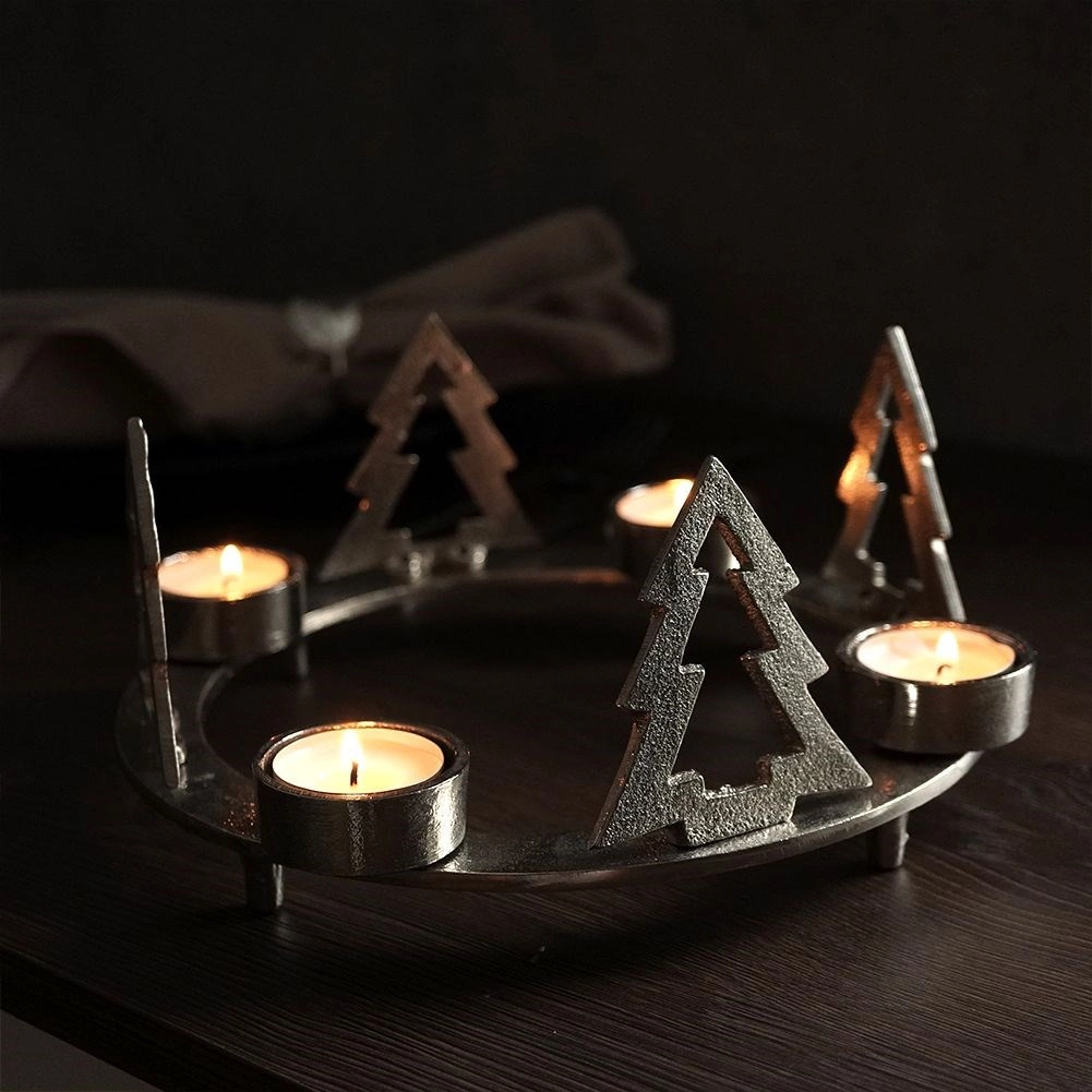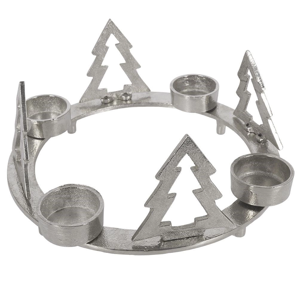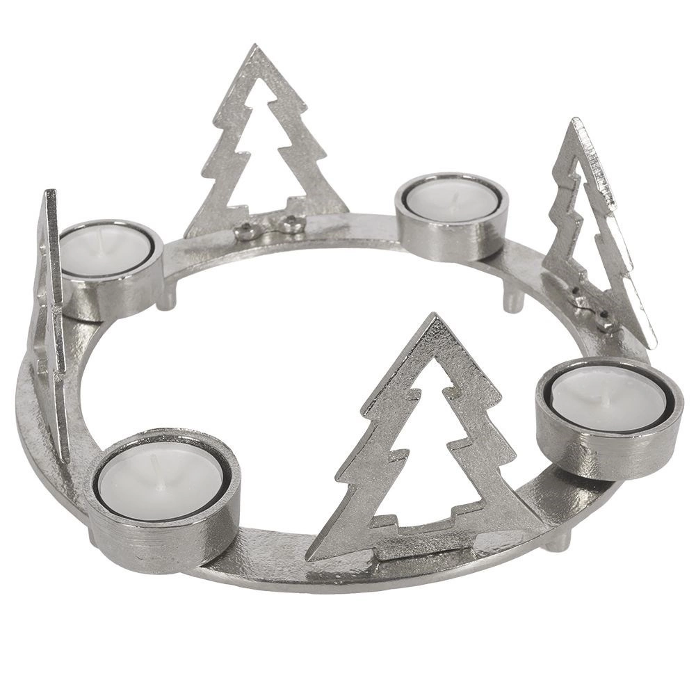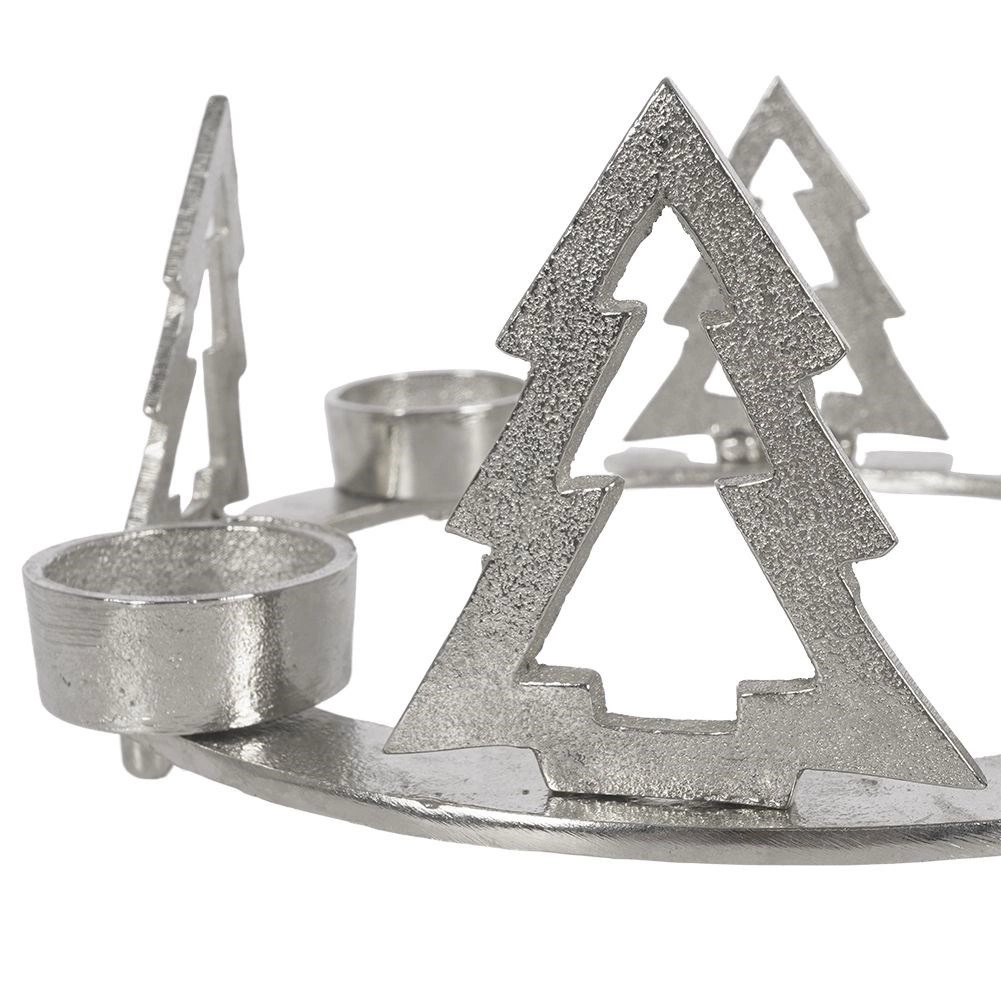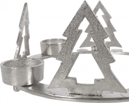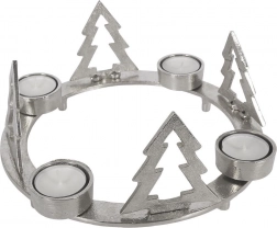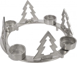 Ovaj kružni svijećnjak za lučice izrađen je od kvalitetnog aluminija u srebrnoj izvedbi i krase ga četiri stilizirane siluete božićnih drvaca. Zahvaljujući promjeru 25 cm i promišljenom rasporedu posudica za svijeće, svijećnjak stvara dojmljivu svjetlosnu igru – idealan kao adventski svijećnjak i cjelosezonska dekoracija.