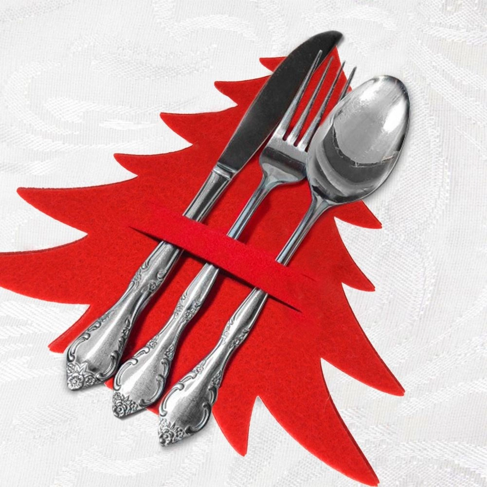 Set od 4 dekorativne futrole za pribor u obliku božićne jelke od čvrstog crvenog filca. Zahvaljujući horizontalnom prorezu, žlicu, vilicu i nož sigurno i pregledno držite na jednom mjestu. Stilski dodatak koji trenutačno naglašava blagdanski ugođaj svakog postavljanja stola.