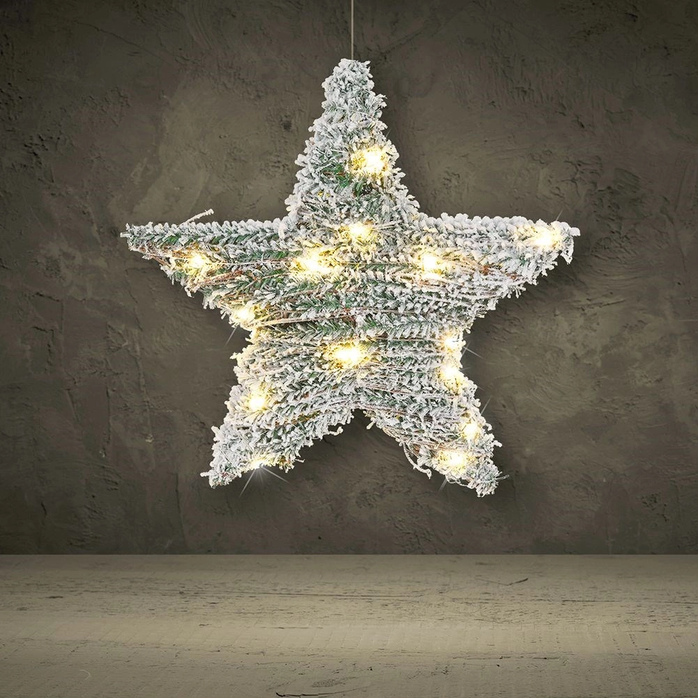 Ova dekorativna božićna zvijezda spaja prirodni pleteni izgled s umjetnim grančicama crnogorice sa snježnim efektom. Integrirane toplo bijele LED ravnomjerno obasjavaju oblik zvijezde i stvaraju ugodnu, intimnu svjetlost za zimske večeri. Zahvaljujući promjeru od 30 cm istaknut će se u svakom interijeru, bilo da je objesite na vrata, u prozor ili je slobodno naslonite na policu.