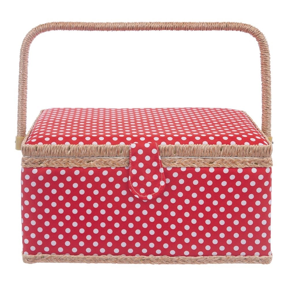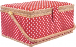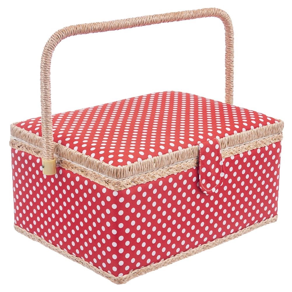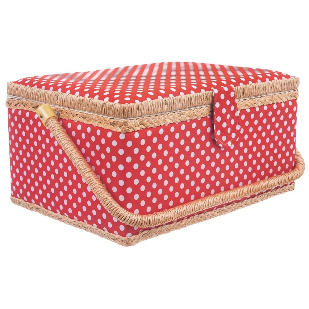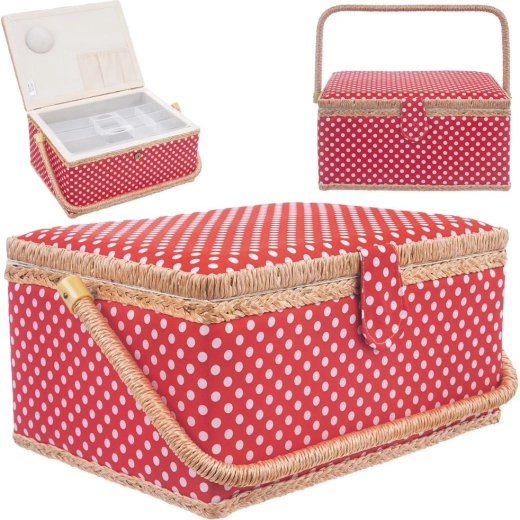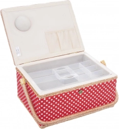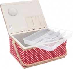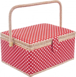 Ova košara za šivanje spaja atraktivan dizajn i promišljenu organizaciju. Tijelo košare presvučeno je tkaninom u crvenoj boji s bijelim točkama te dopunjeno čvrstom ručkom za lako prenošenje. Zahvaljujući magnetskom zatvaranju košaru možete sigurno zatvoriti jednim pokretom, a sadržaj ostaje na mjestu i tijekom prenošenja.