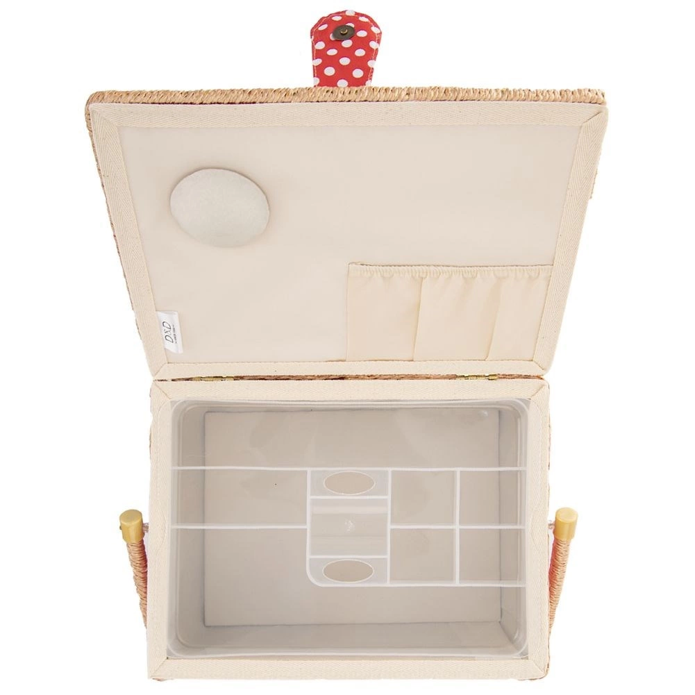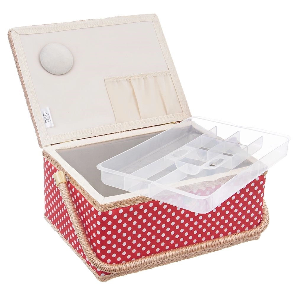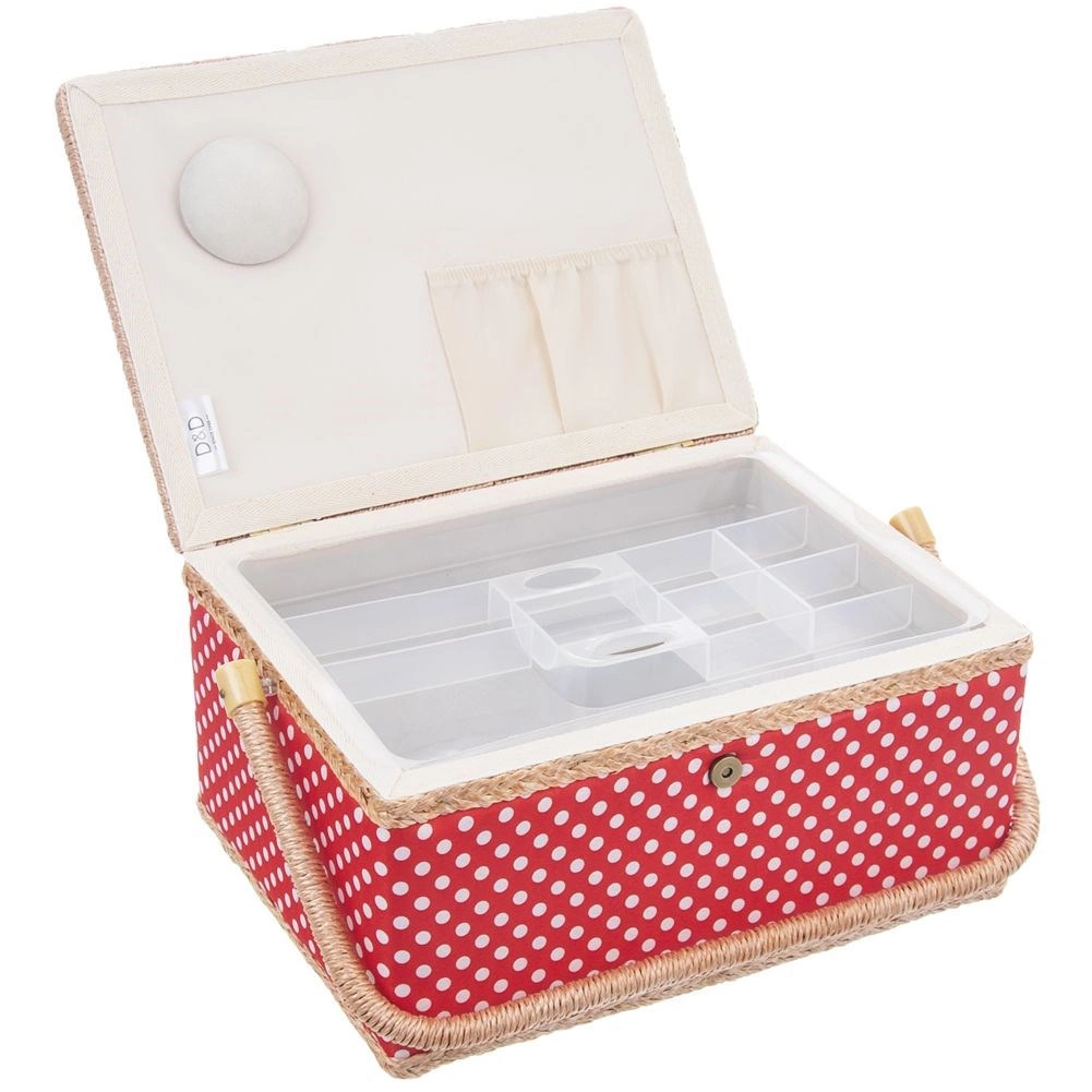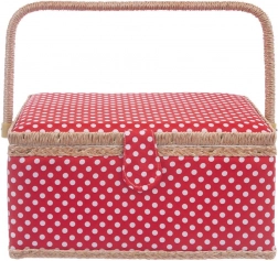 Ova košara za šivanje spaja atraktivan dizajn i promišljenu organizaciju. Tijelo košare presvučeno je tkaninom u crvenoj boji s bijelim točkama te dopunjeno čvrstom ručkom za lako prenošenje. Zahvaljujući magnetskom zatvaranju košaru možete sigurno zatvoriti jednim pokretom, a sadržaj ostaje na mjestu i tijekom prenošenja.