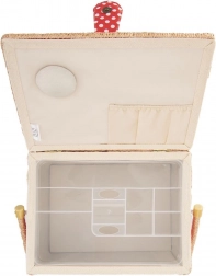 Unutra se nalazi izvadivi plastični organizator s 4 pretinca za konce, igle, uvlačivače ili gumbe. Nakon njegova vađenja dobivate prostranu komoru za veće krojačke alate. Unutarnja strana poklopca opremljena je elastičnim džepom i jastučićem za igle, gdje možete praktično zataknuti pribadače i igle. Košara je izvrsna i kao organizator za bižuteriju.