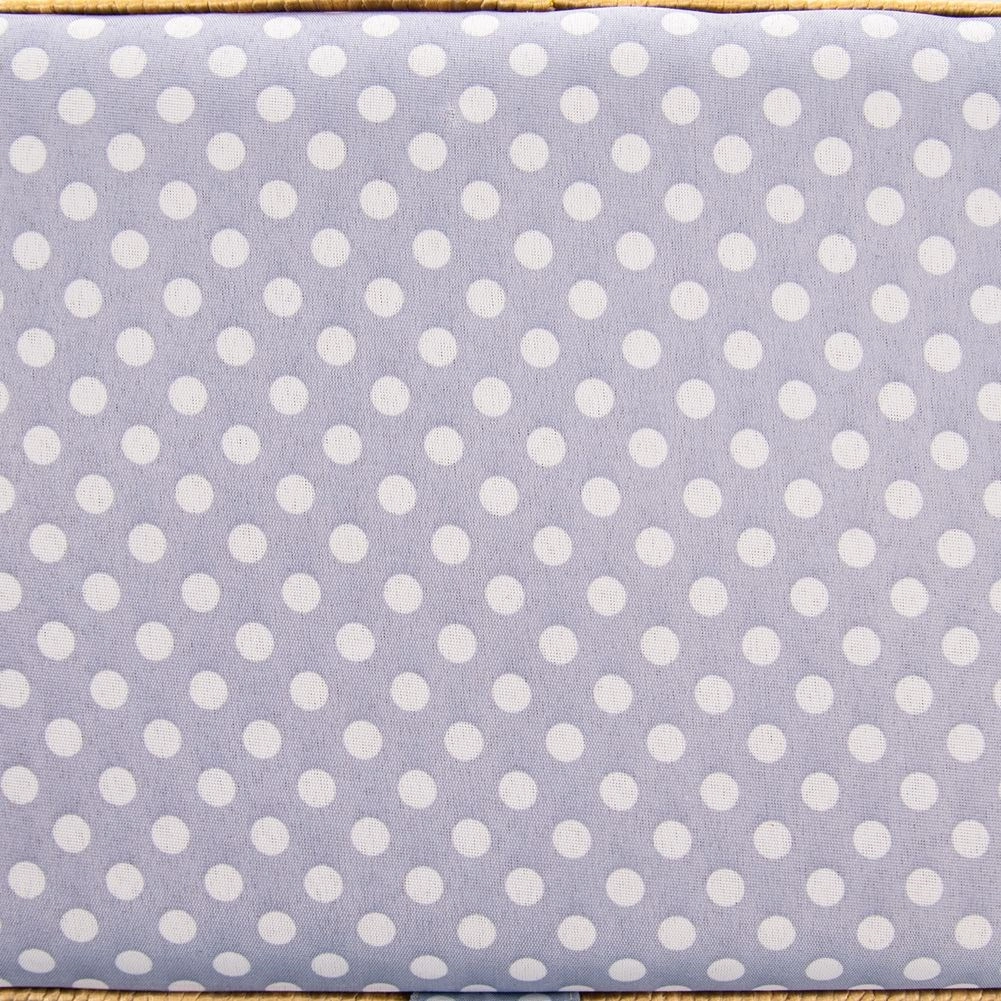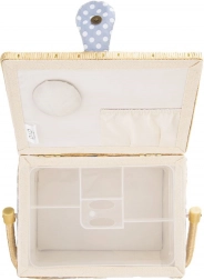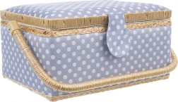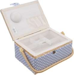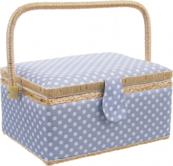 Košara je presvučena izdržljivom tkaninom u plavoj boji s bijelim točkicama i opremljena čvrstom sklopivom ručkom za lako prenošenje. Odlično služi ne samo kao kutija za šivanje, već i kao organizator za bižuteriju ili kreativne potrepštine.