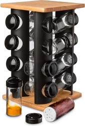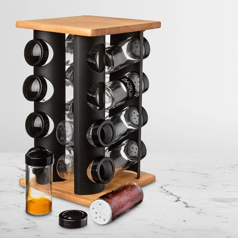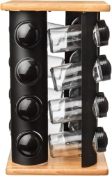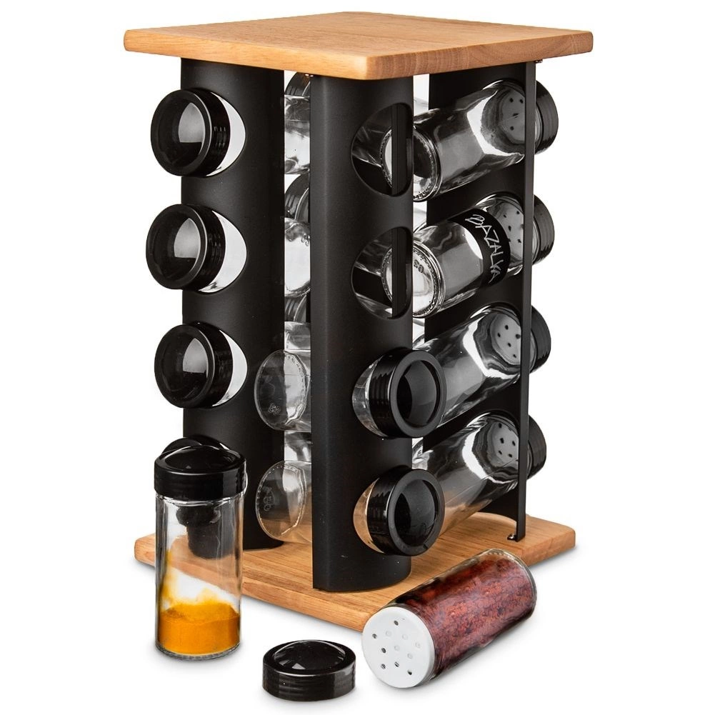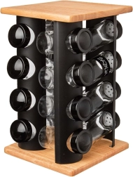 Održavajte red u začinima i imajte sve pri ruci. Rotirajući stalak s gornjom i donjom drvenom pločom te crnom metalnom konstrukcijom prima 16 staklenki za začine. Svaka staklenka ima navojni crni poklopac i bijelo sito za udobno i ravnomjerno posipanje. Prozirno staklo omogućuje brzu provjeru sadržaja i količine.