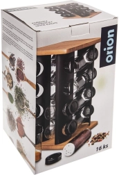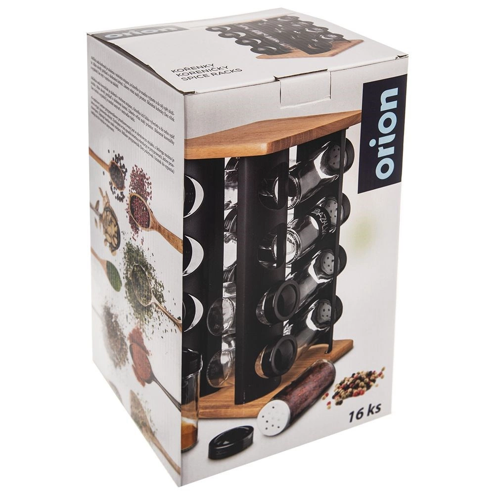 Elegantni rotirajući stalak za začine s 16 staklenim posudicama održat će vašu kuhinju preglednom i stilskom. Kombinacija crnog metala i drva je čvrsta i izdržljiva, staklenke zapremine 80 ml imaju navojne poklopce i sita za lako doziranje. Zahvaljujući rotirajućoj konstrukciji brzo ćete pronaći željeni začin, a prozirne stijenke staklenki omogućuju trenutnu kontrolu sadržaja. Staklene dijelove moguće je prati u perilici posuđa. Marka ORION.