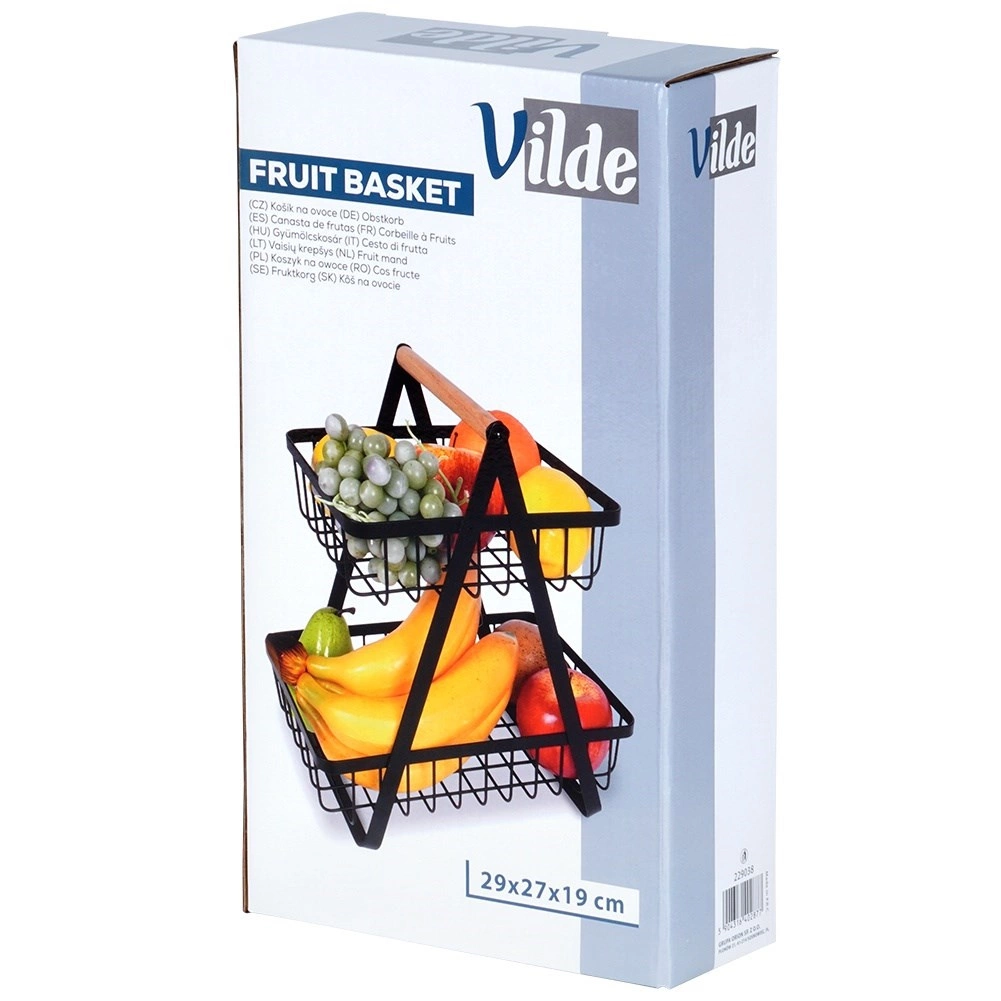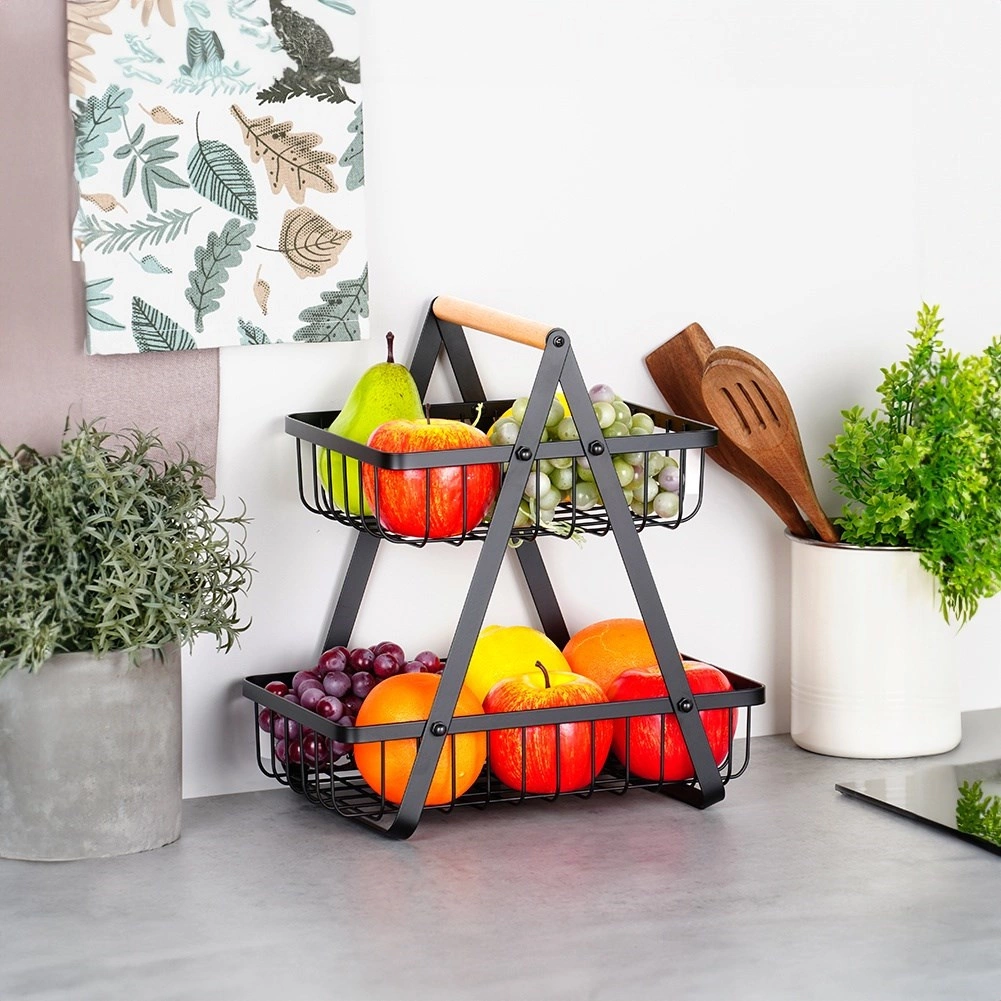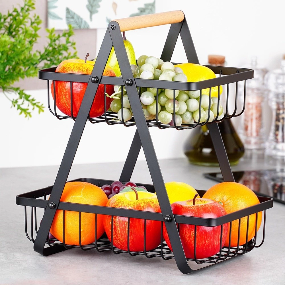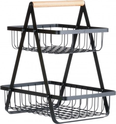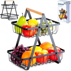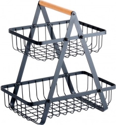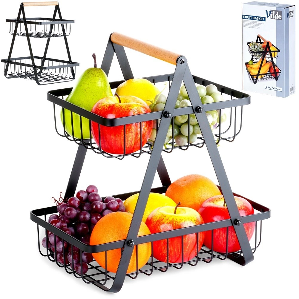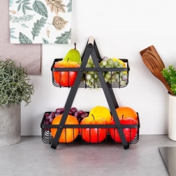 Stilski dvoslojni stalak za voće i povrće spaja moderni industrijski dizajn s praktičnim vertikalnim odlaganjem koje štedi prostor na kuhinjskoj radnoj plohi. Otvorene žičane košare čine sadržaj dobro vidljivim i prozračenim, pa će jabuke, naranče i grožđe ostati dulje svježi.