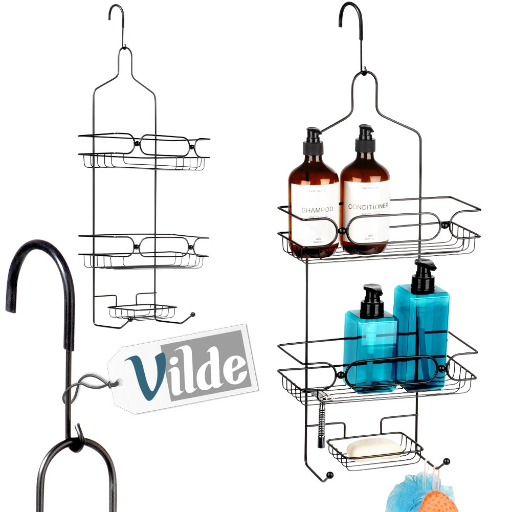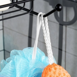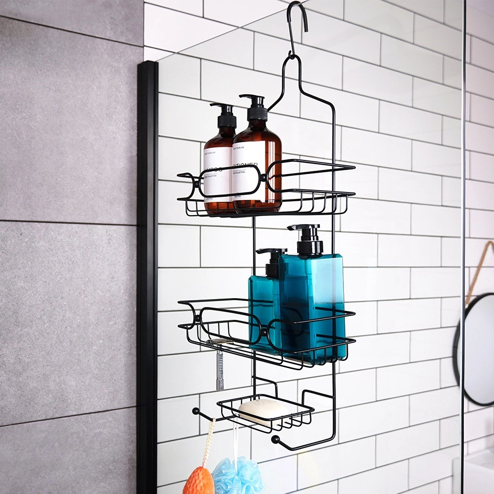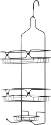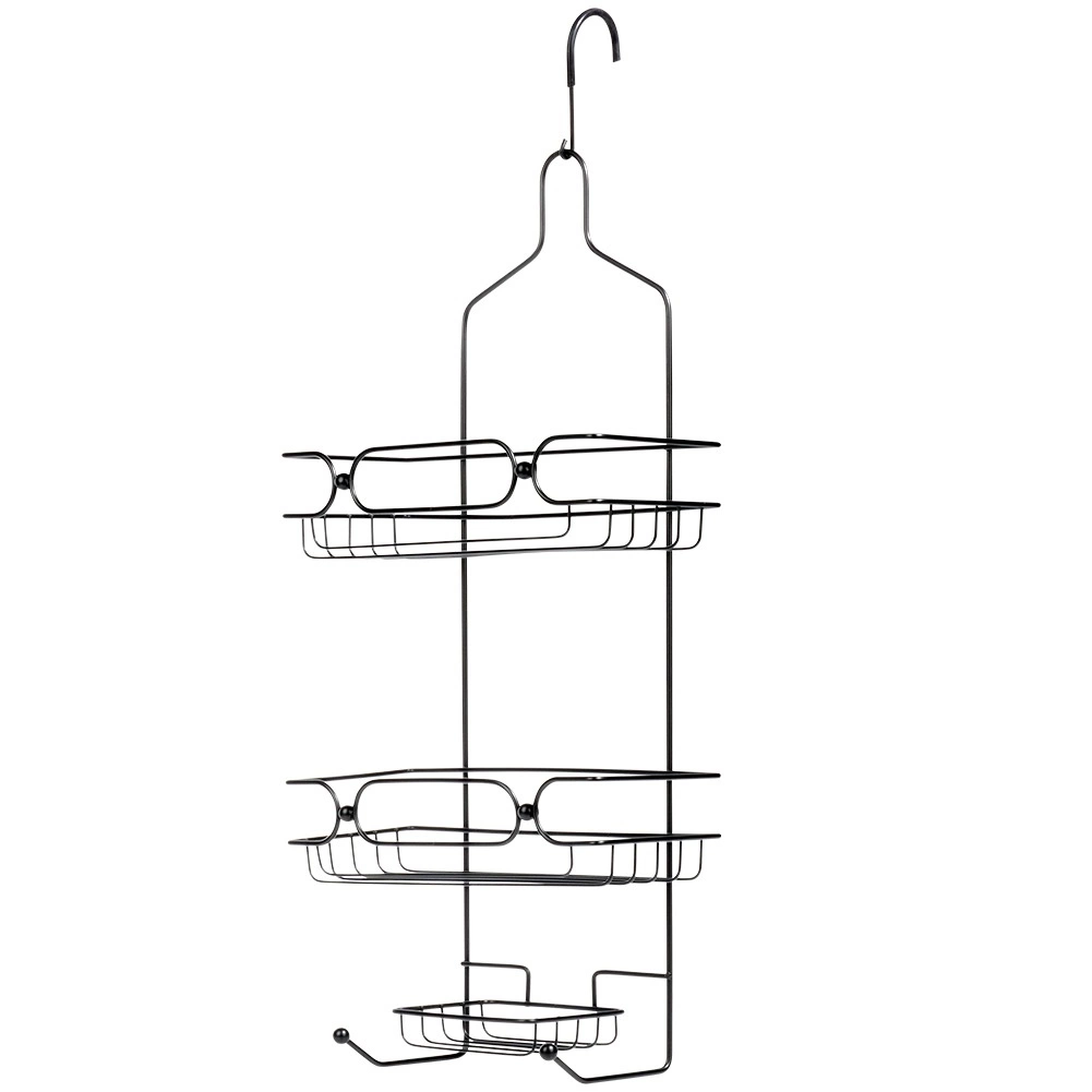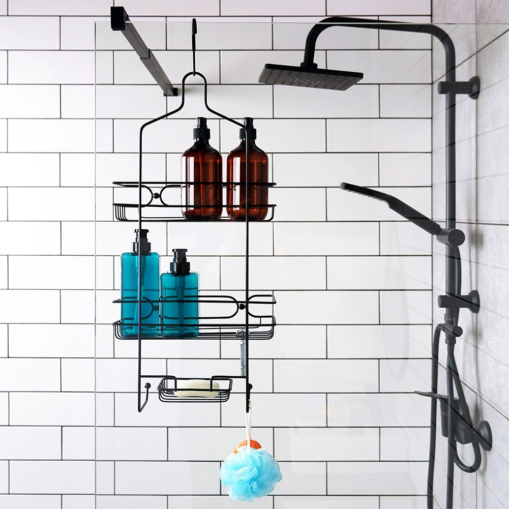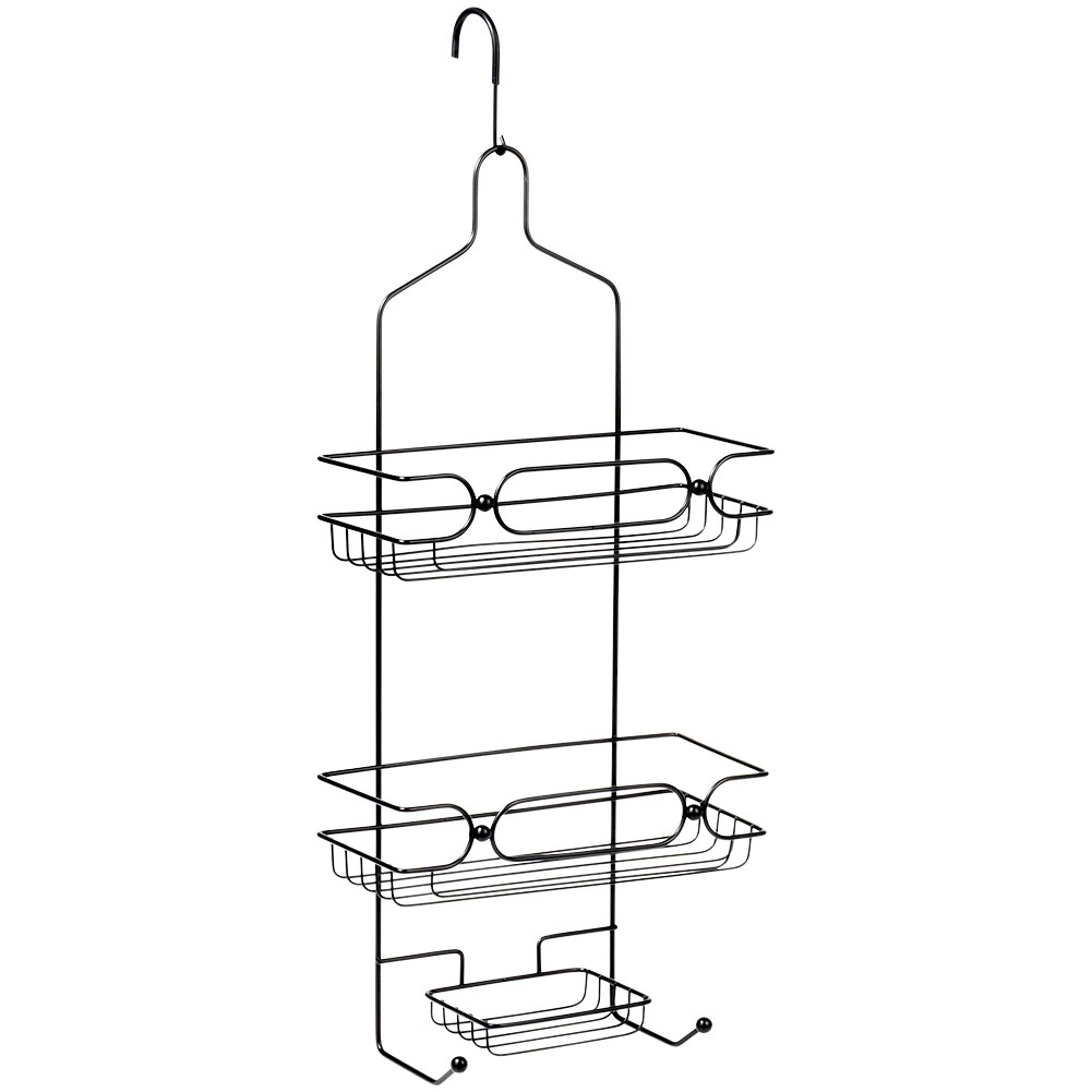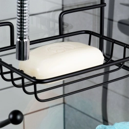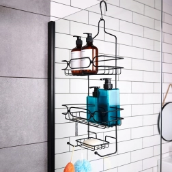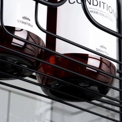 Kvalitetan crno lakirani metal je čvrst i otporan na koroziju, pa polica pouzdano podnosi svakodnevnu upotrebu. Gumeni premaz na vješalici štiti staklo i sprječava klizanje. Dvije velike police primaju šampone i gelove, donja posudica za sapun i par kukica idealni su za spužve, britvice ili četke.