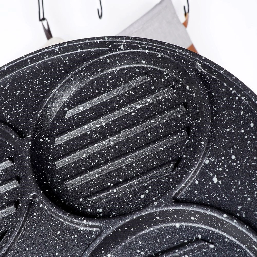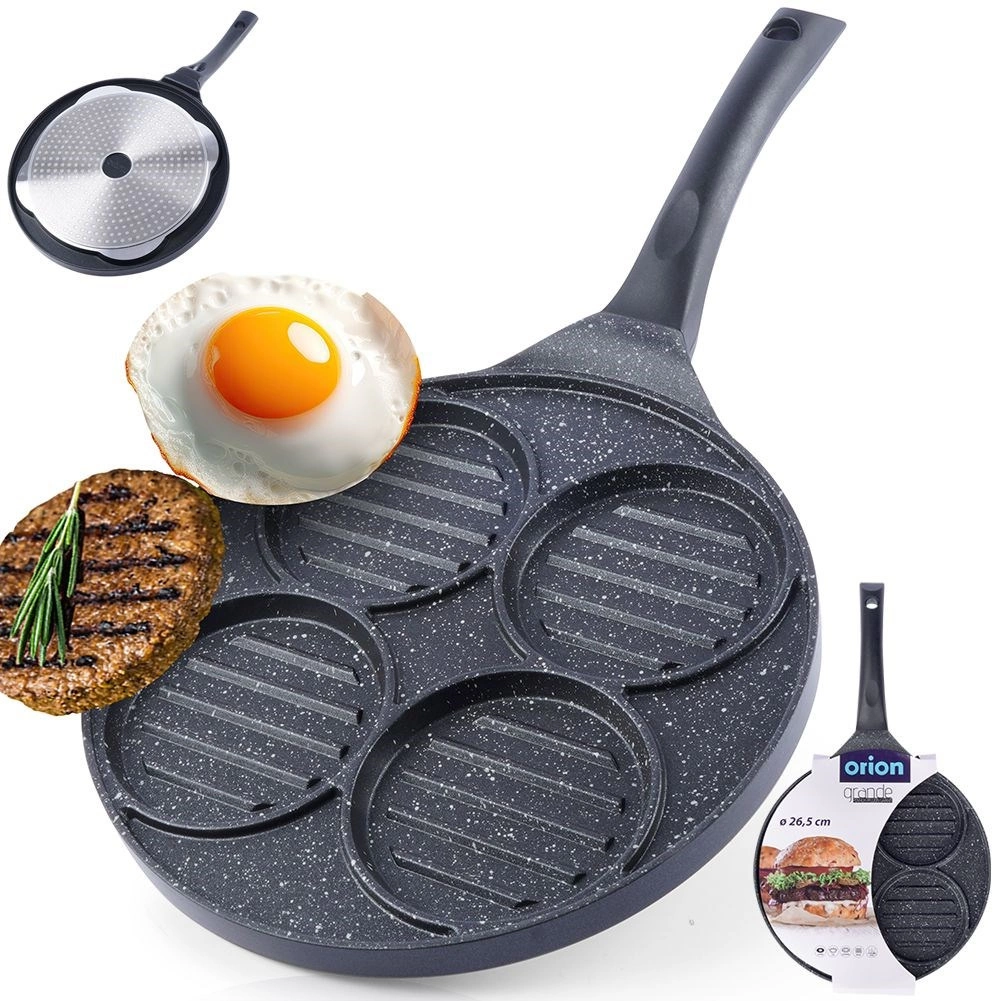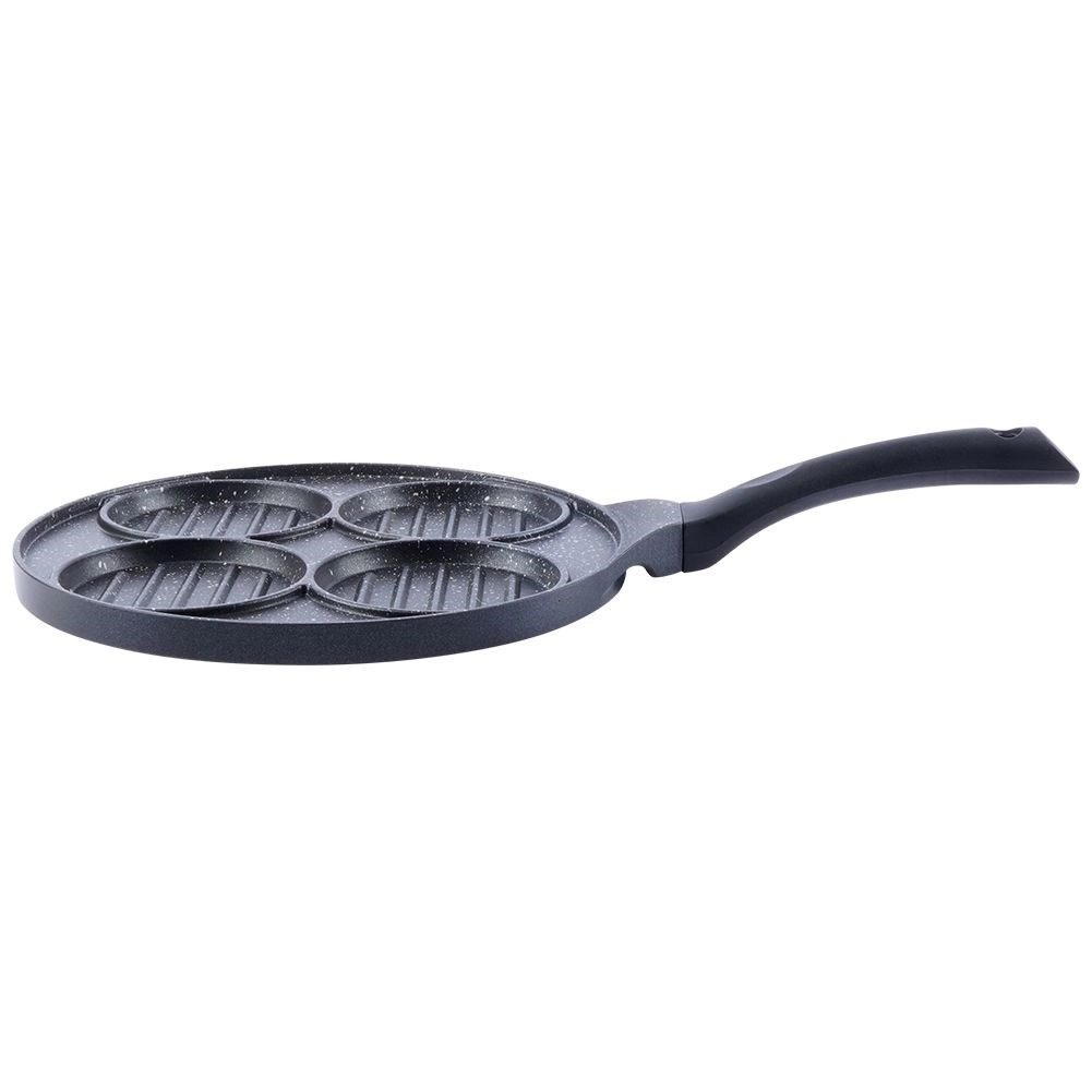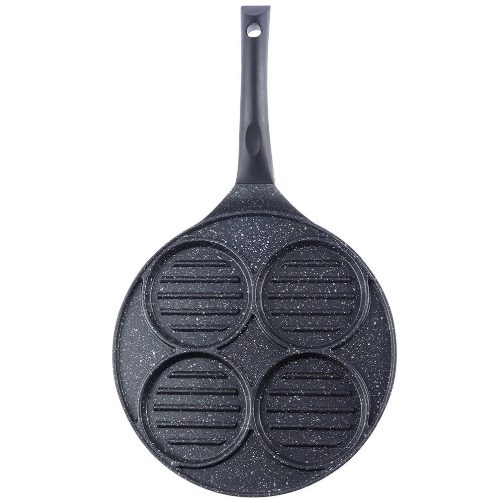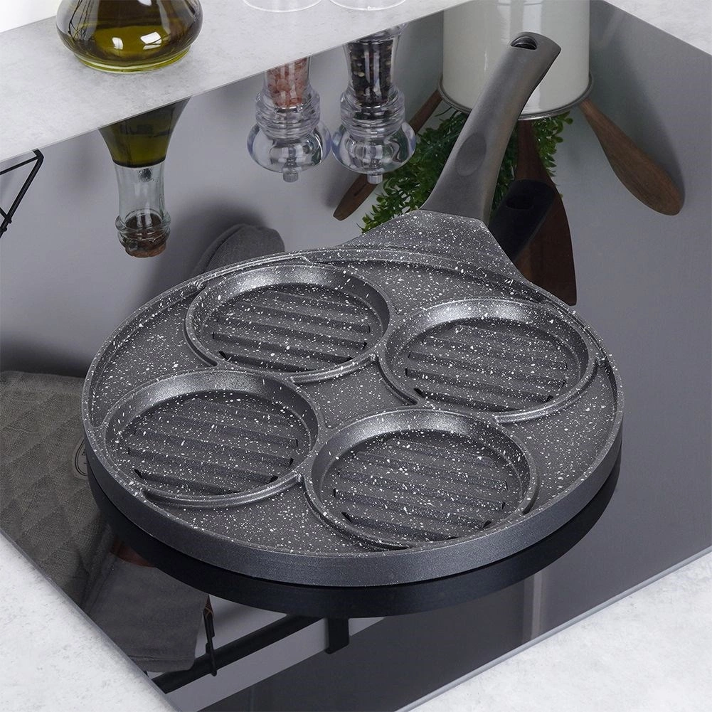 Ova višenamjenska tava promjera 26,5 cm s četiri odvojena kružna odjeljka (svaki cca 10 cm) omogućuje pripremu burgera, jaja na oko, palačinki ili povrtnih popečaka istovremeno i bez miješanja okusa. Granitni neljepljivi sloj PFLUON GRANIT osigurava minimalno zagorijevanje, manju potrošnju ulja i lako čišćenje.