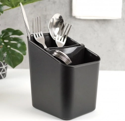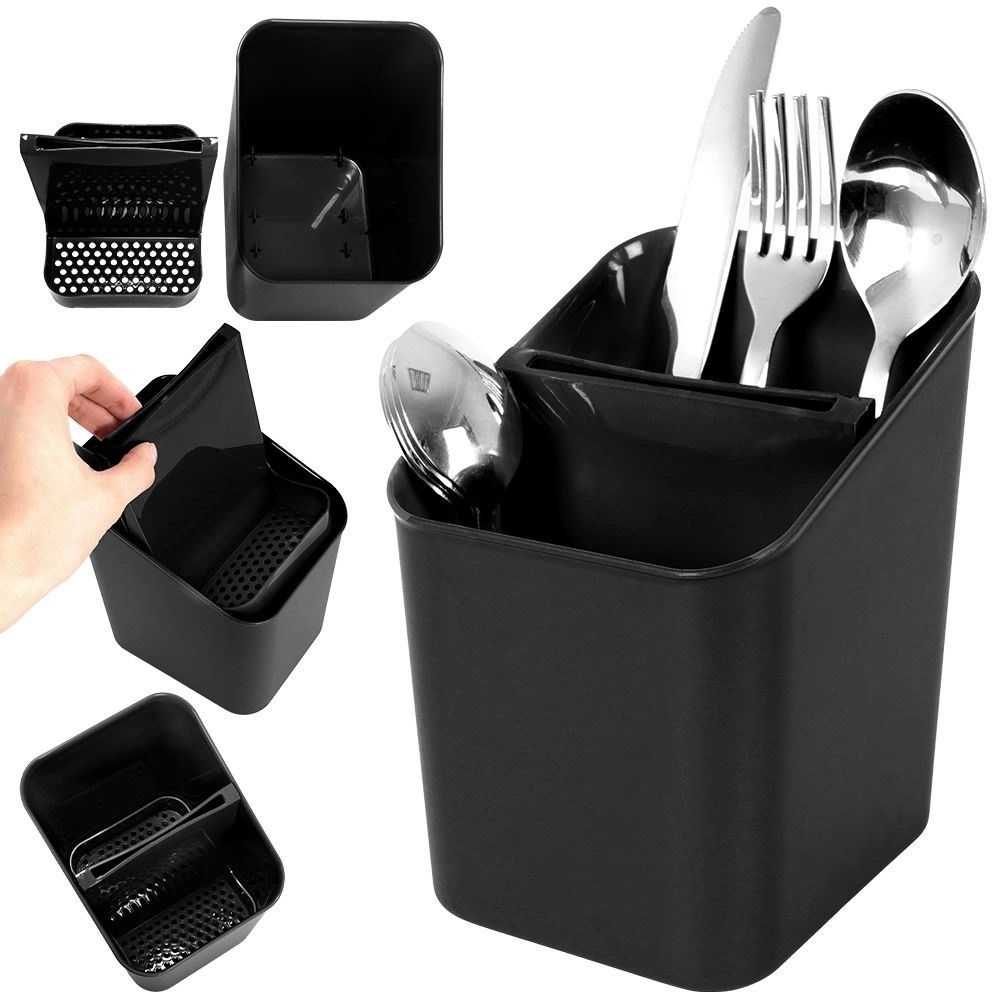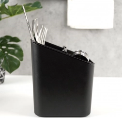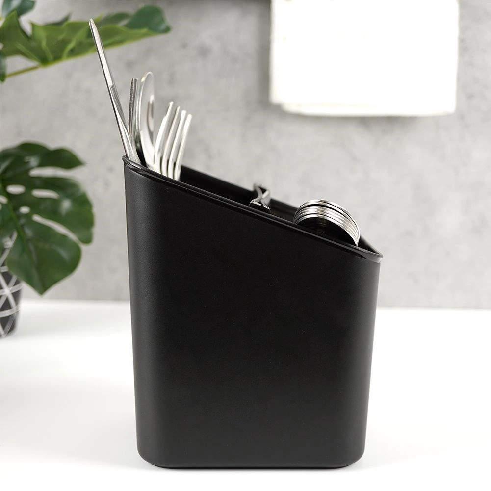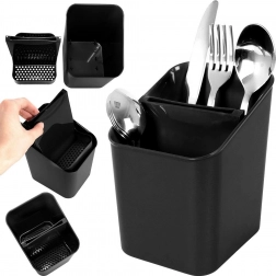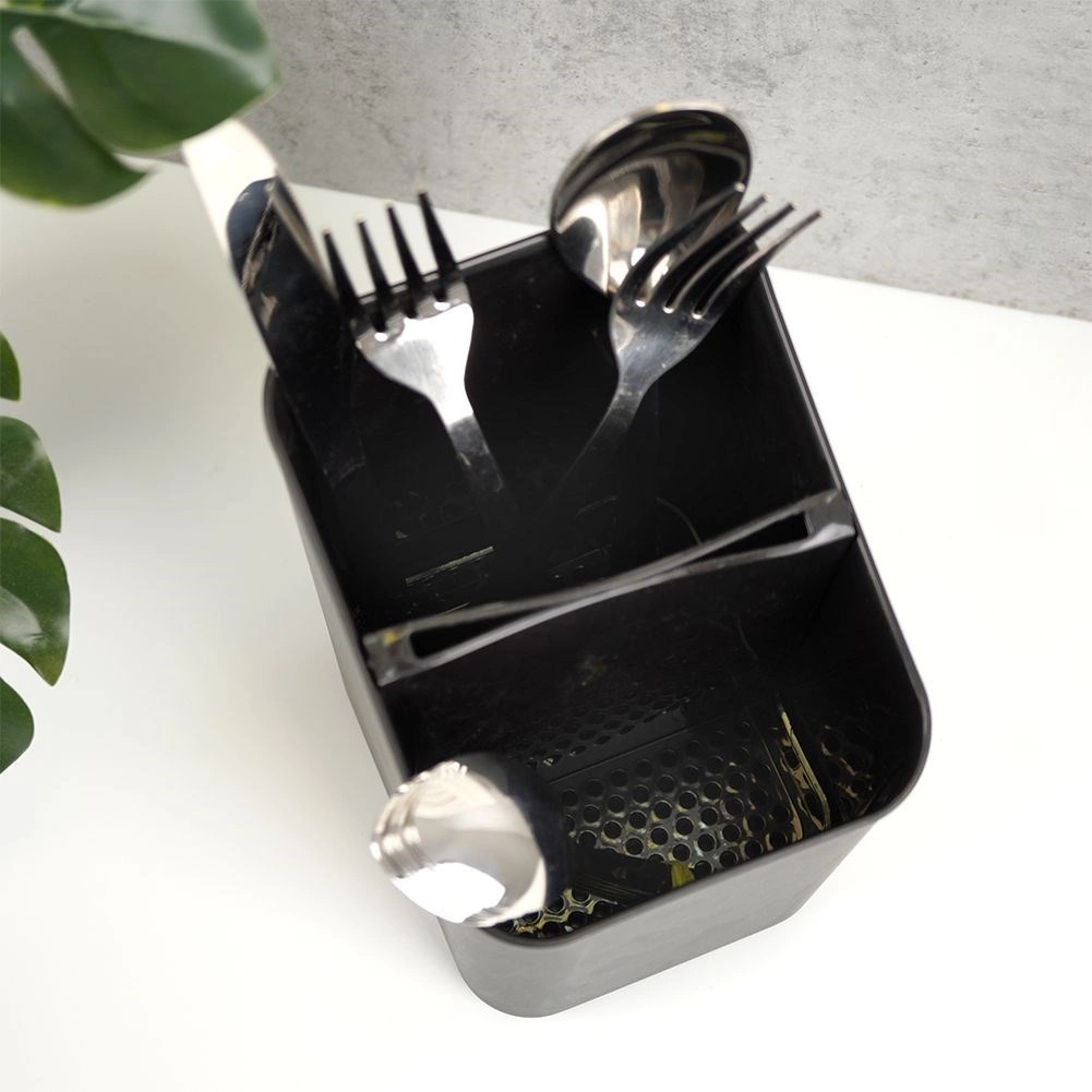Elegantni i funkcionalni ocjeđivač za pribor za jelo u bezvremenskoj crnoj boji održat će vašu kuhinju organiziranom i čistom. Zahvaljujući izvadivom separatoru lako ćete razdvojiti pribor, a nakon njegovog vađenja dobit ćete prostranu posudu s jednom komorom. Perforirano dno omogućuje brz odvod vode, tako da pribor ne stoji u vlazi, a radna ploha ostaje suha.