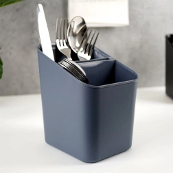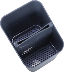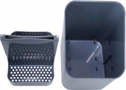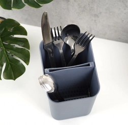 Dimenzije 14 × 11 × 16 cm osiguravaju kompaktnu veličinu za radnu plohu i uz sudoper. Ocjeđivač služi ne samo za sušenje opranog pribora za jelo, već i kao organizator kuhinjskog alata – žlice, vilice, noževi ili četke za boce uvijek će biti pri ruci. Održavanje je maksimalno jednostavno, cijeli držač možete prati u perilici posuđa.