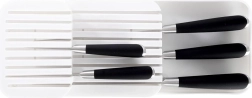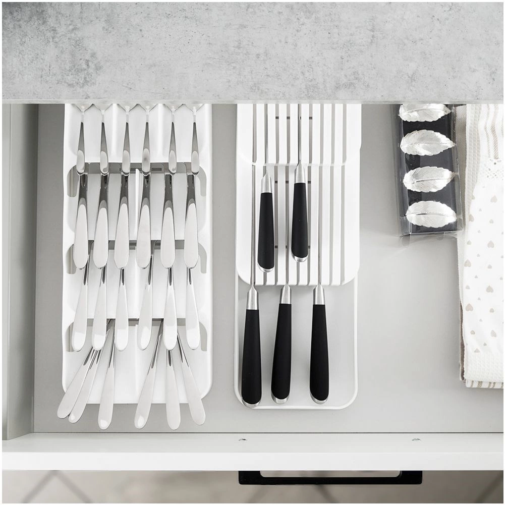 Održite kuhinju savršeno urednom s ovim bijelim organizatorom za noževe za ladicu dimenzija 39 × 14,5 × 7,5 cm. Nudi do 18 utora za kratke i duge noževe, dvorazinsko odlaganje radi uštede prostora i izdržljivu izradu od kvalitetne plastike. Kompaktan je, siguran i zahvaljujući univerzalnim dimenzijama odgovara većini kuhinjskih ladica.