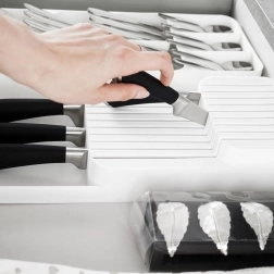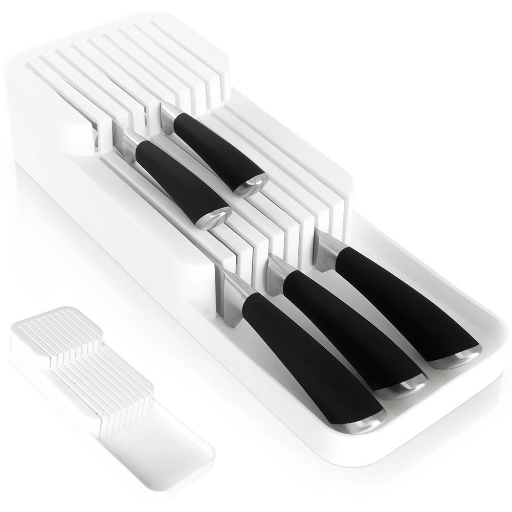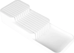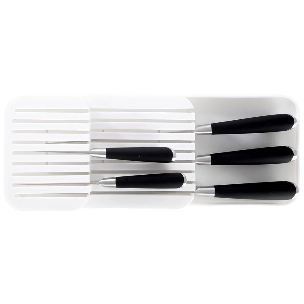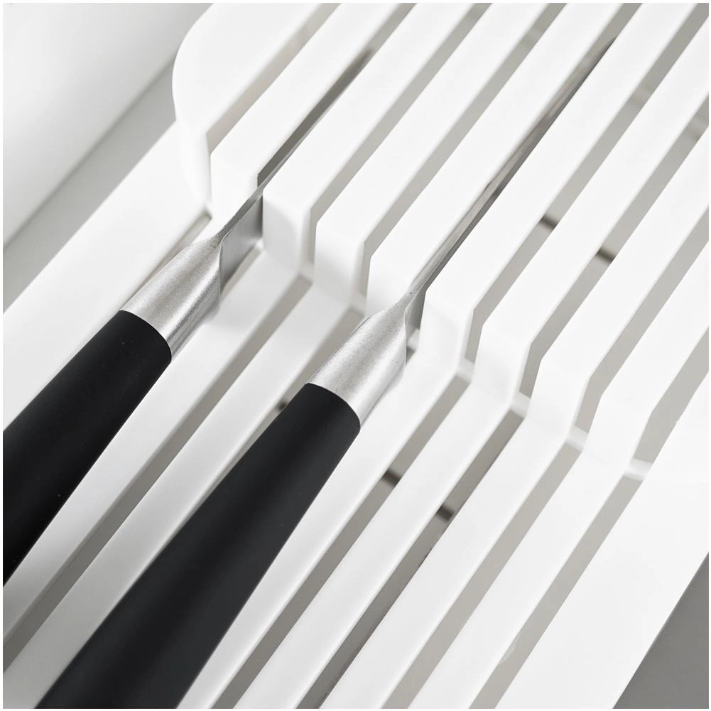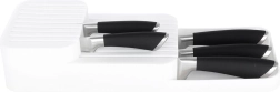 Praktičan i prostorno učinkovit organizator za noževe pomaže držati vaše oštrice pregledno i sigurno pohranjene. Dvorazinska konstrukcija štedi prostor u ladici, dok oblikovani utori drže svaki nož na svom mjestu. Minimalistički bijeli dizajn uklapa se u svaku modernu kuhinju.