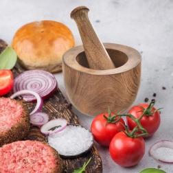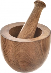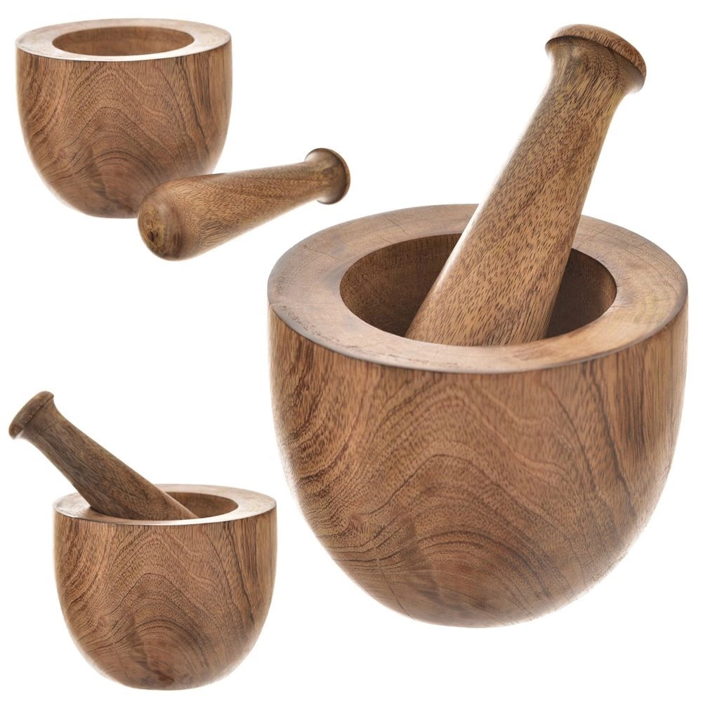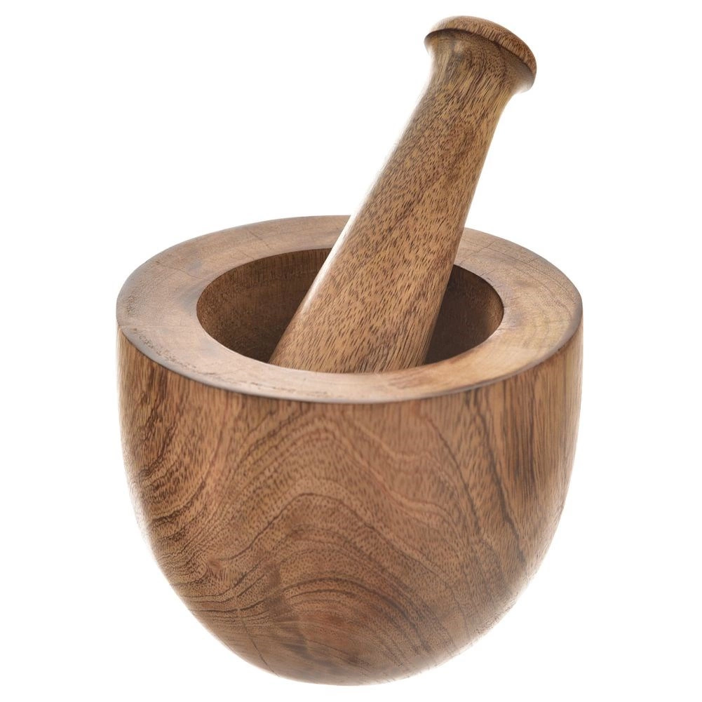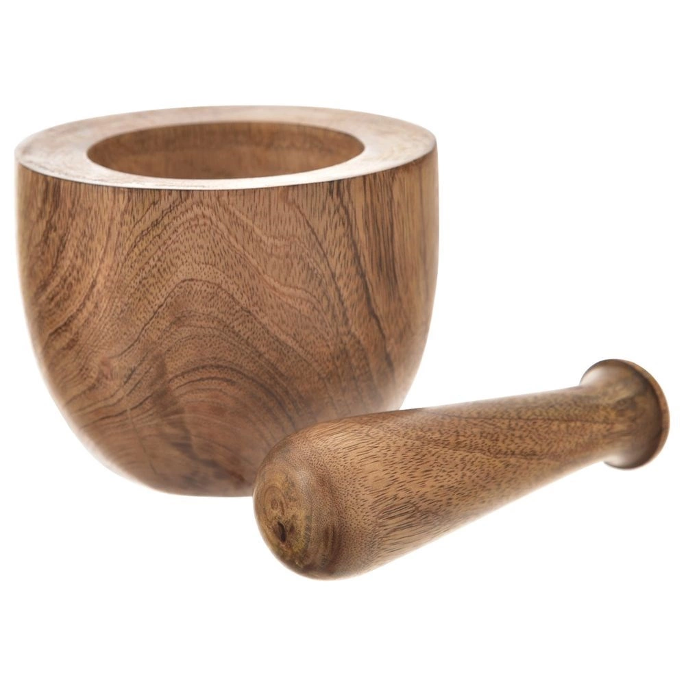 Otkrijte snagu poštenog ručnog drobljenja. Mužar od mangova drva nudi izvrsnu stabilnost, ugodan hvat i prirodno grublju unutarnju površinu za maksimalno trenje. Zahvaljujući tome lako razvija pun okus svježih i tvrđih sastojaka – od papra i kima do sjemenki ili orašastih plodova.