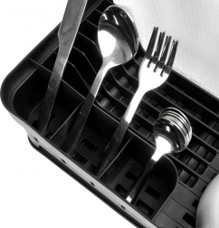 Promišljena podjela pruža prostor za tanjure, šalice i pribor. Tri odvojena odjeljka za pribor ubrzavaju sušenje i organizaciju, utori za tanjure drže posuđe stabilno u uspravnom položaju, a odvodna posuda lako se vadi i čisti. Ocjedna posuda idealna je za svakodnevnu upotrebu, a zahvaljujući kompaktnim dimenzijama stane i na manje kuhinjske pultove.