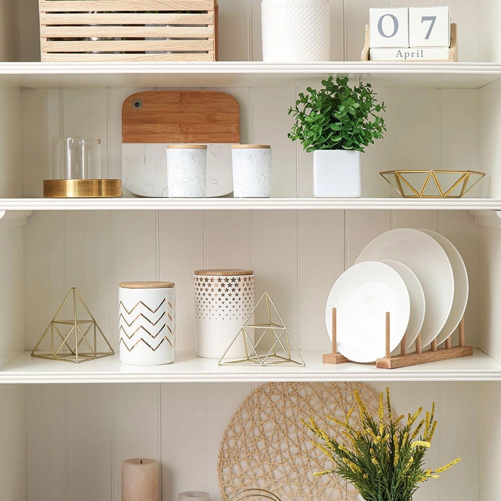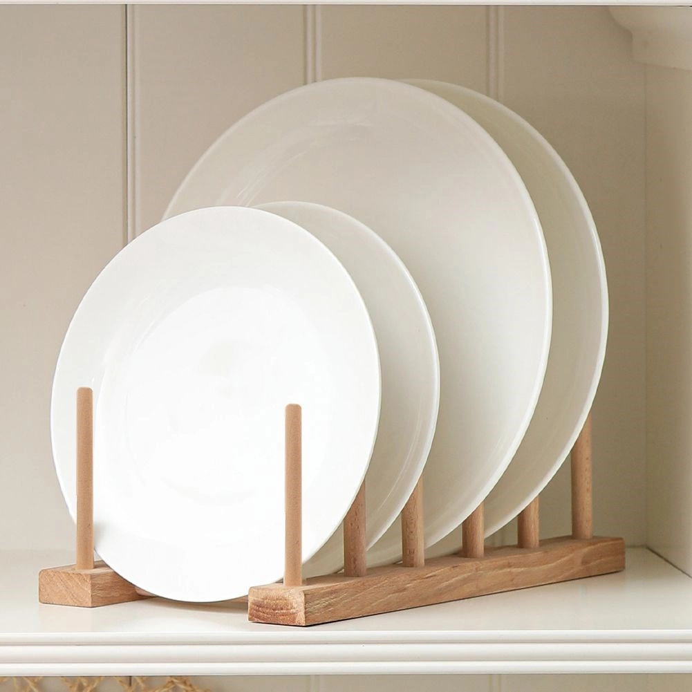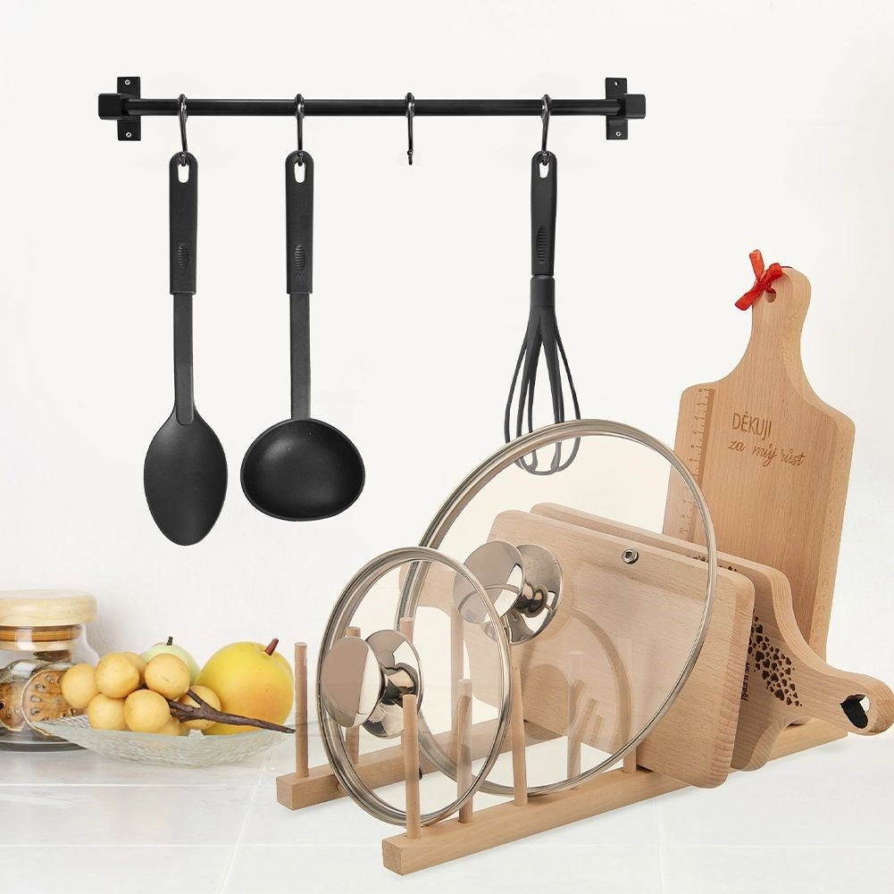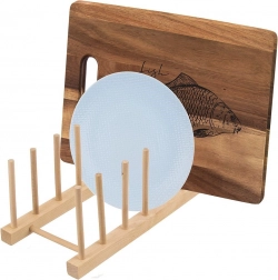 Organizirajte poklopce, plitke i duboke tanjure te daske za rezanje pregledno na jednom mjestu. Drveni stalak s osam pozicija drži posuđe u uspravnom položaju, pa je odmah pri ruci, bolje se suši i vlaga se ne zadržava. Minimalistički izgled i prirodna boja lako se uklapaju u svaki kuhinjski stil.