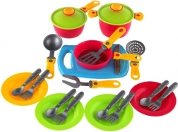 Ovaj šareni set posuđa s daskom savršen je za dječje kuhinje i igru kuhanja. Lagan, ali čvrst materijal osigurava sigurno i dugotrajno korištenje, a pojedini dijelovi dobro leže u dječjoj ruci.