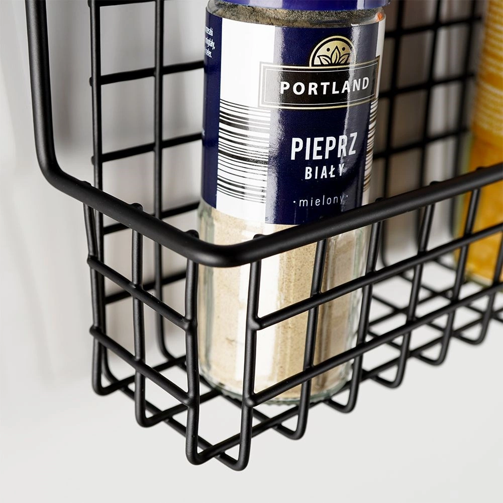 Izdržljiv crni metal s žičanom košarom drži začine i male bočice sigurno na mjestu te olakšava njihovu preglednu organizaciju.