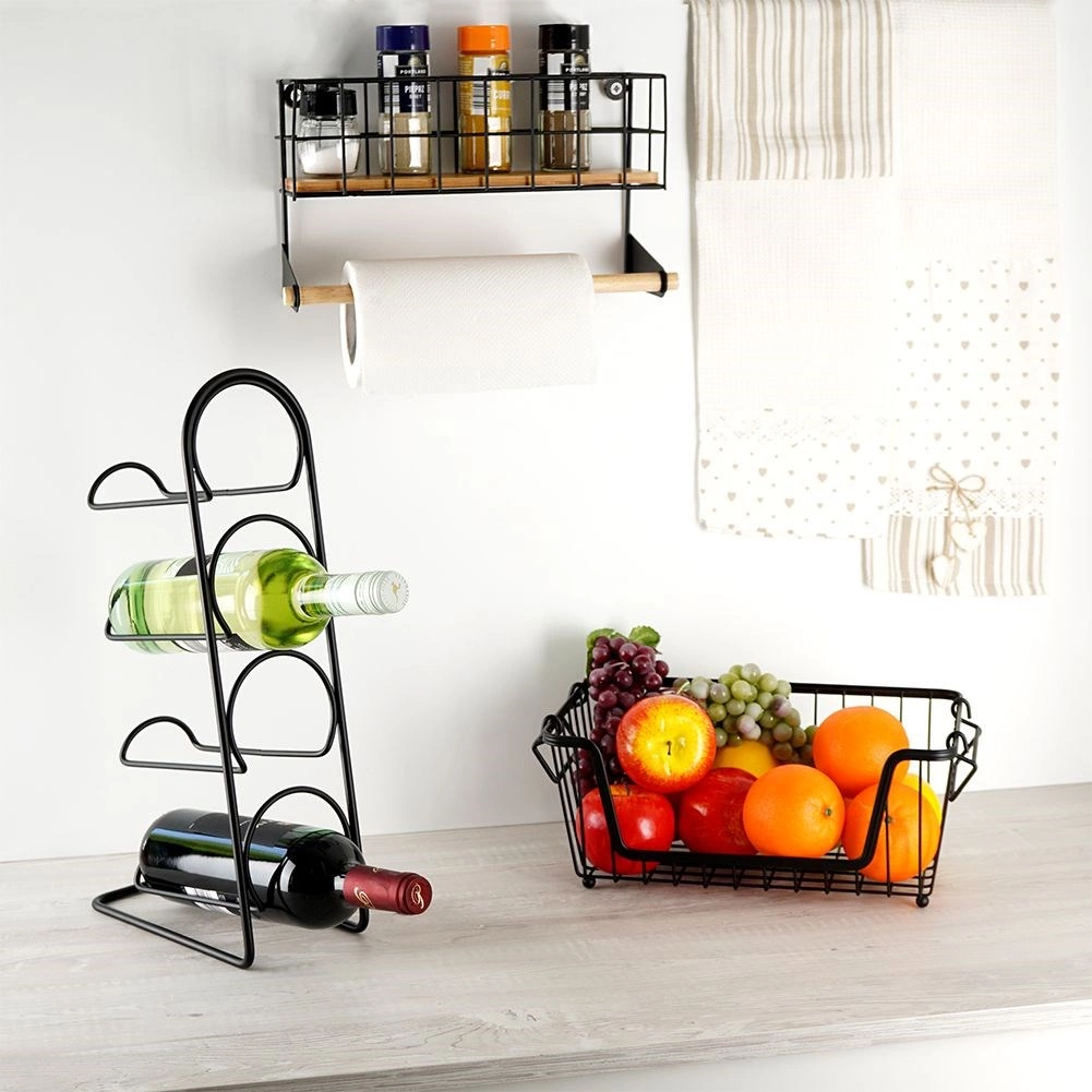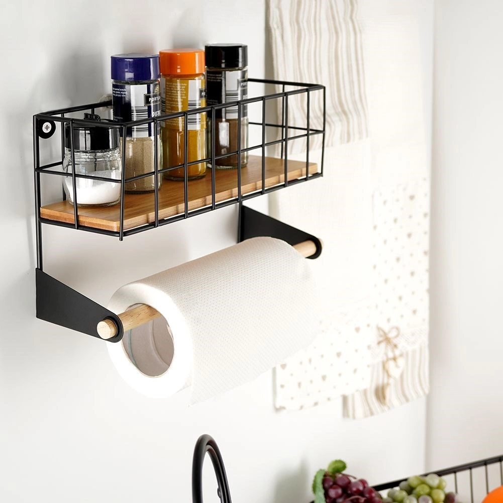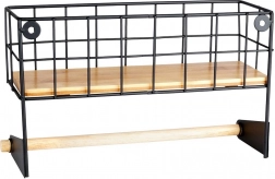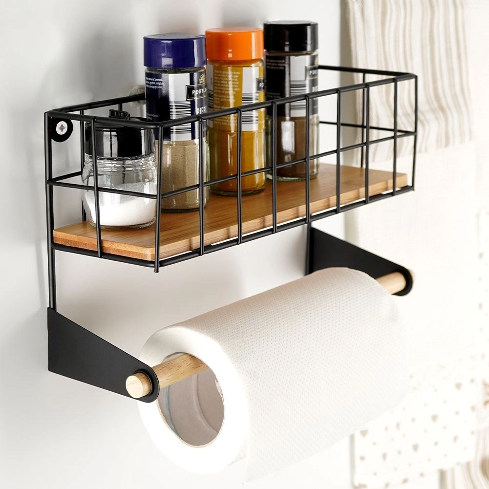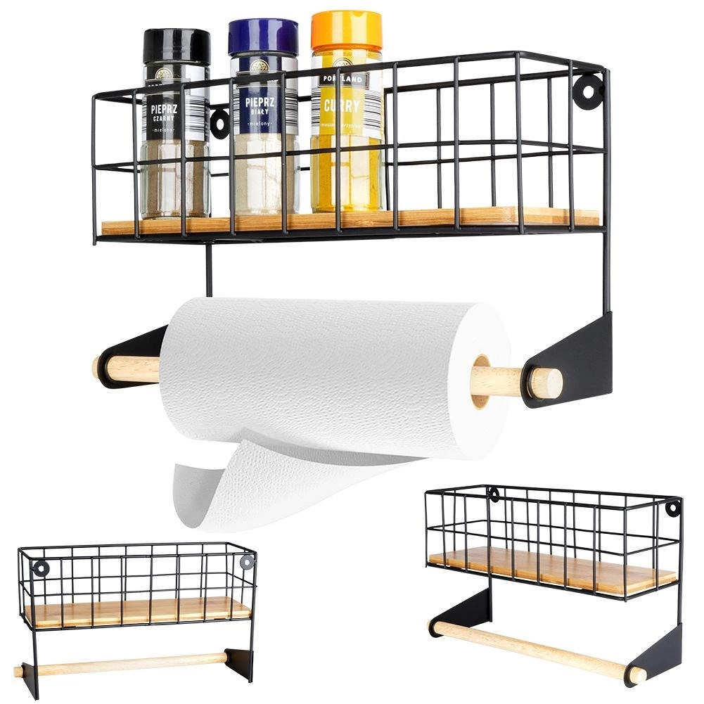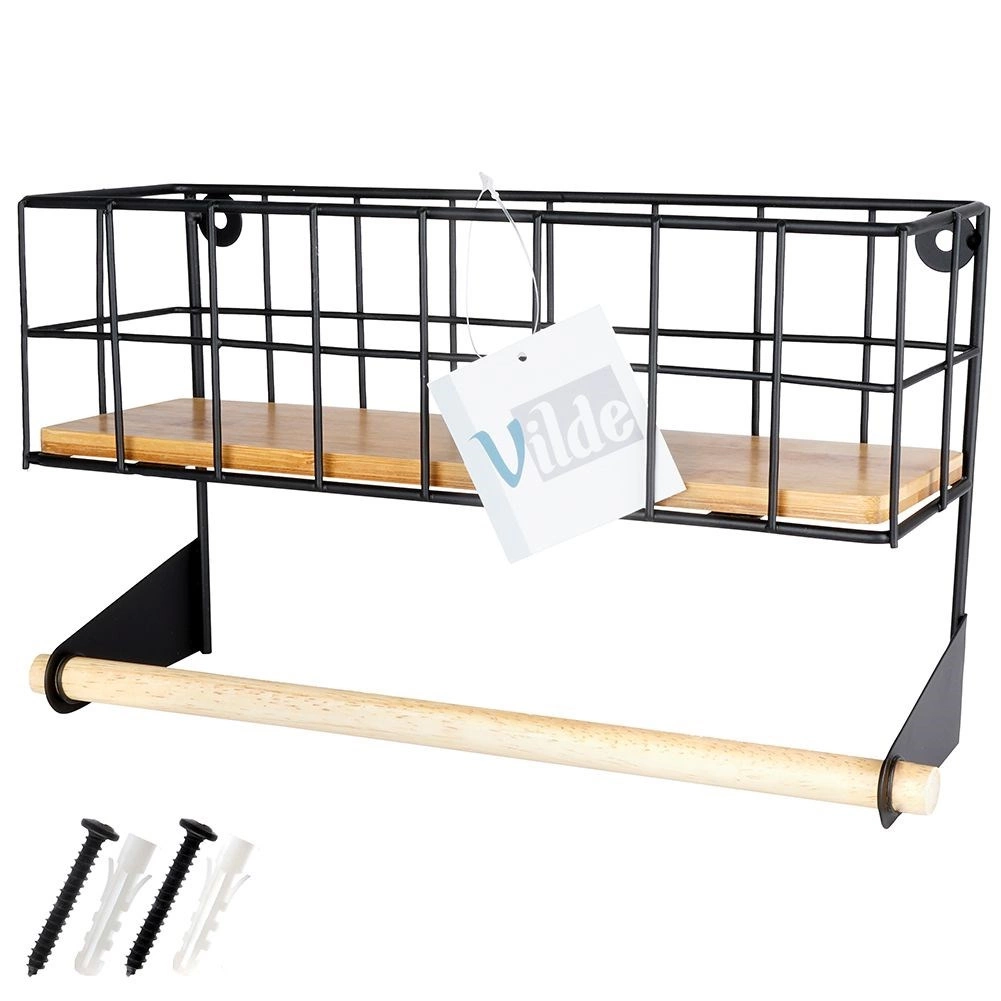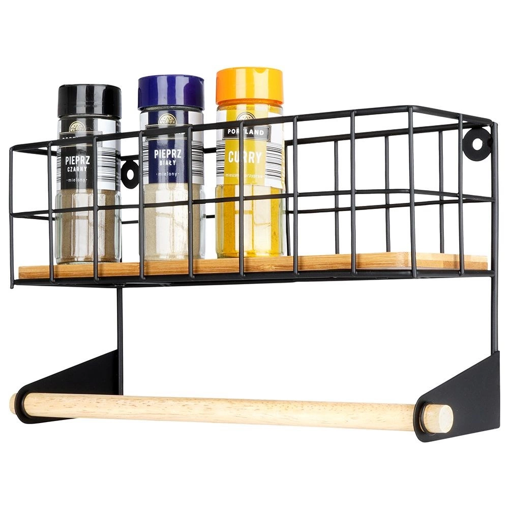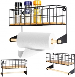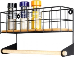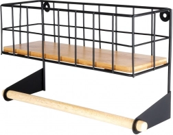 Ova zidna polica s integriranim držačem za papirnate ručnike pametno će organizirati kuhinju. Gornja košara prima začine ili male staklenke, a donja drvena šipka omogućuje ugodno odmotavanje ručnika. Izdržljiva izvedba od crnog metala s praškastim premazom i bambusovi detalji daju prostoru moderan industrijski izgled.