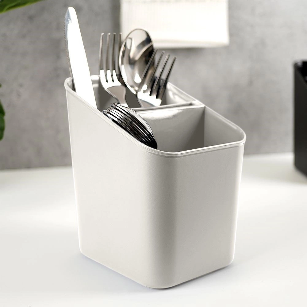 Praktičan ocjeđivač i stalak za pribor za jelo u sivoj boji osigurava da su vaše vilice, žlice i noževi uvijek uredno posloženi i brzo suhi. Zahvaljujući uklonjivom separatoru s dvije pregrade i perforiranom dnu, čišćenje je jednostavno, a voda sigurno otječe, pa radna ploča ostaje čista. Proizvod je lagan, izdržljiv, univerzalan i ima klasičan dizajn koji se uklapa u svaku kuhinju.