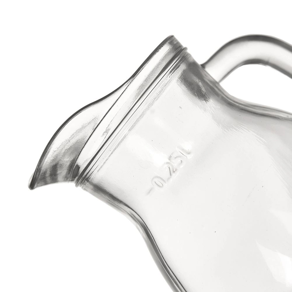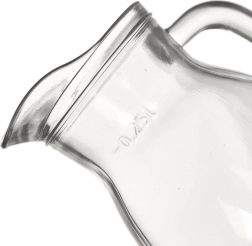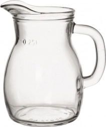 Praktični stakleni vrč ukupnog volumena 300 ml s oznakom 0,25 l za precizno doziranje. Od izdržljivog prozirnog stakla, s udobnom ručkom i profiliranim izljevom za čisto točenje. Pogodan za mlijeko, vrhnje, vino, vodu, sok i umake, za perilicu posuđa i mikrovalnu. Maksimalna temperatura napitka 60 °C.