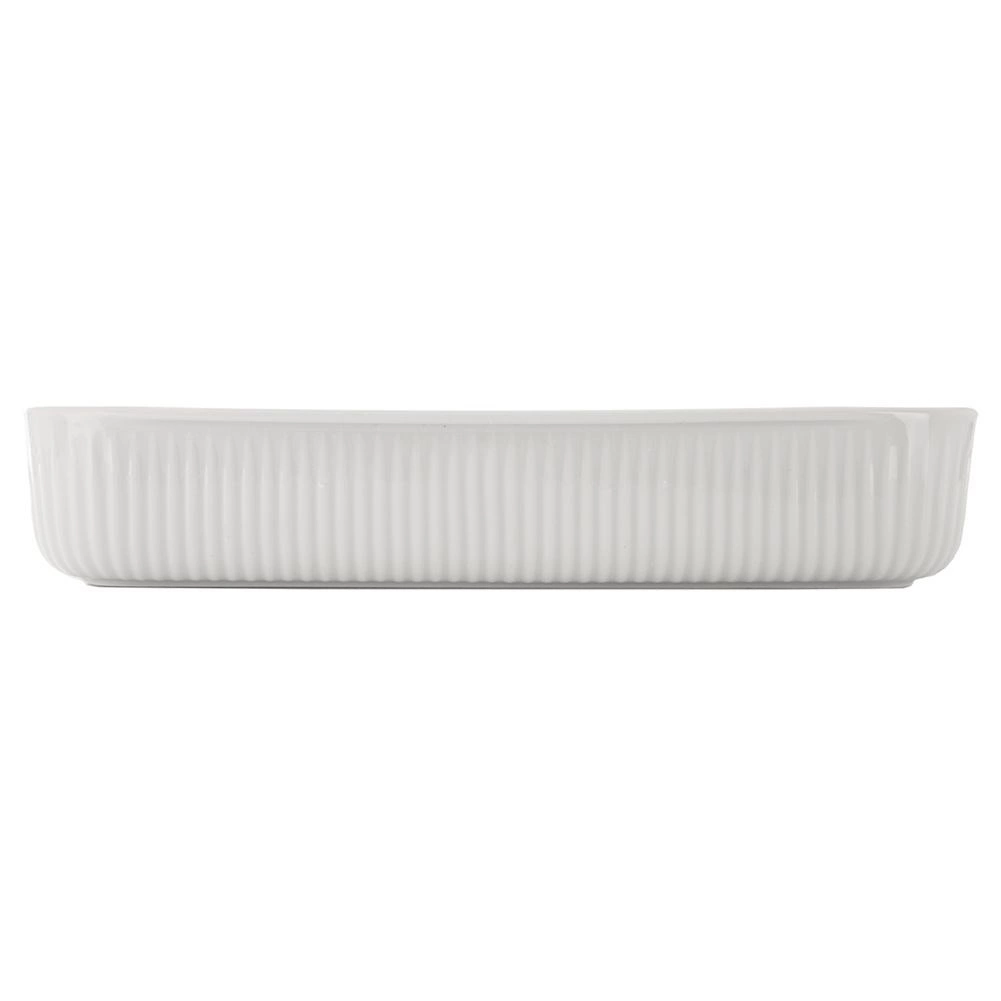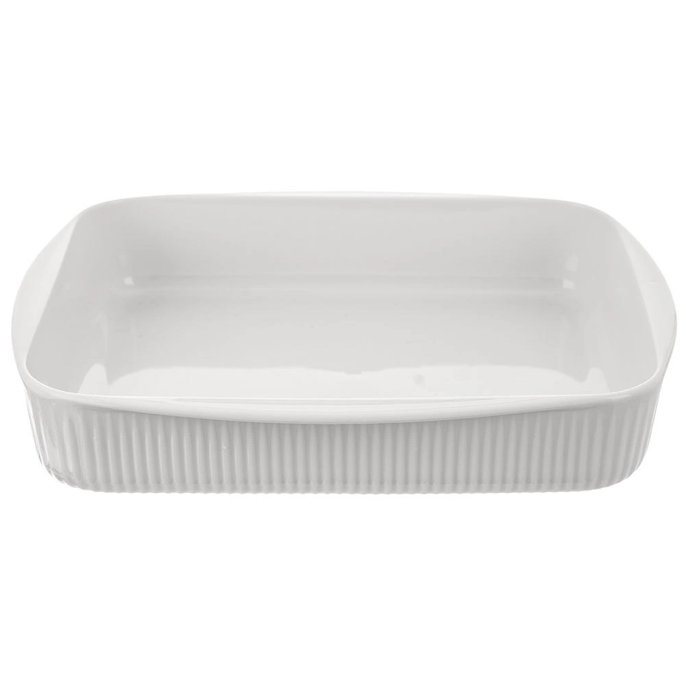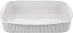 Praktična bijela porculanska posuda za pečenje zapremnine 2,2 l i dimenzija 30,5 × 24,5 × 5,5 cm za svakodnevno pečenje i posluživanje. Izrađena od kvalitetnog porculana iz tradicionalne porcelanske tvornice u Karlovačkoj regiji, pogodna za pećnicu, mikrovalnu pećnicu, hladnjak i perilicu posuđa. Rebrana vanjska površina, glatka unutarnja glazura za lako istresanje i čišćenje te integrirane bočne ručke za ugodno prenošenje.