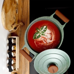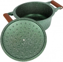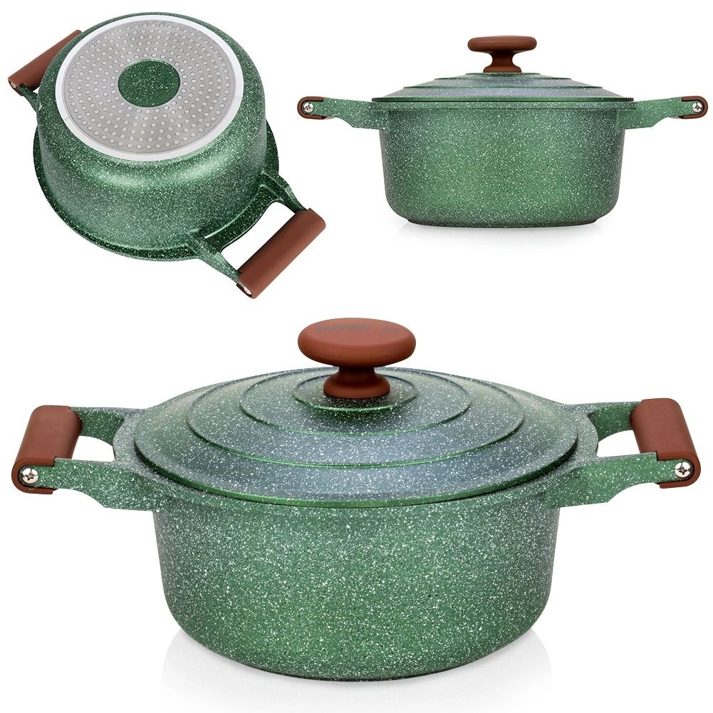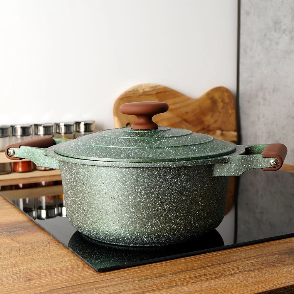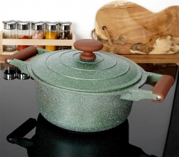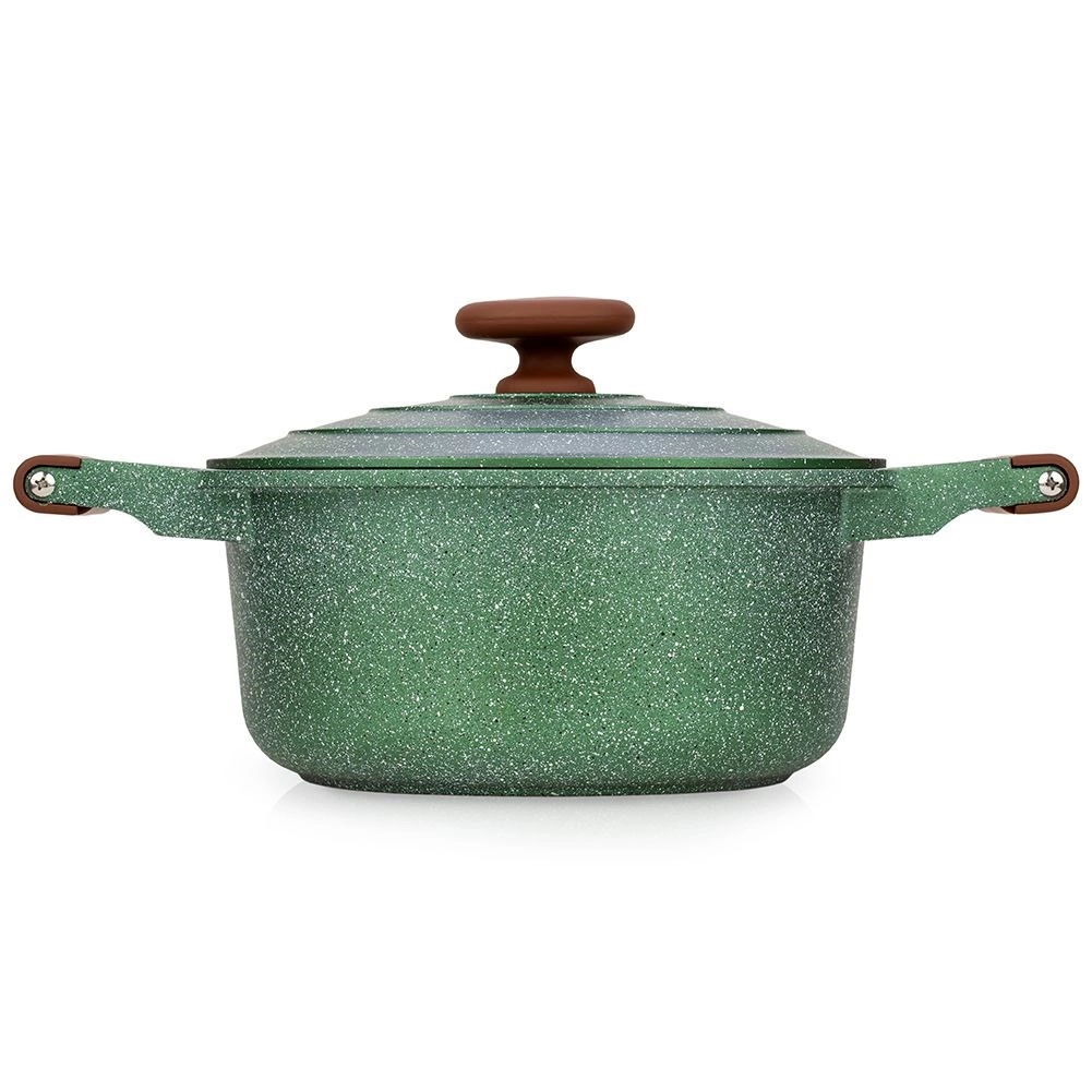 Otkrijte praktičnost i eleganciju u jednom. Ovaj tamnozeleni granitni lonac s smeđim soft touch ručkama oduševit će bezvremenskim izgledom i izvrsnim učinkom. Petoslojni granitni premaz osigurava neljepljivost, otpornost na visoke temperature i lako čišćenje, pa će kuhanje biti brzo, zdravo i bez nepotrebne masnoće.