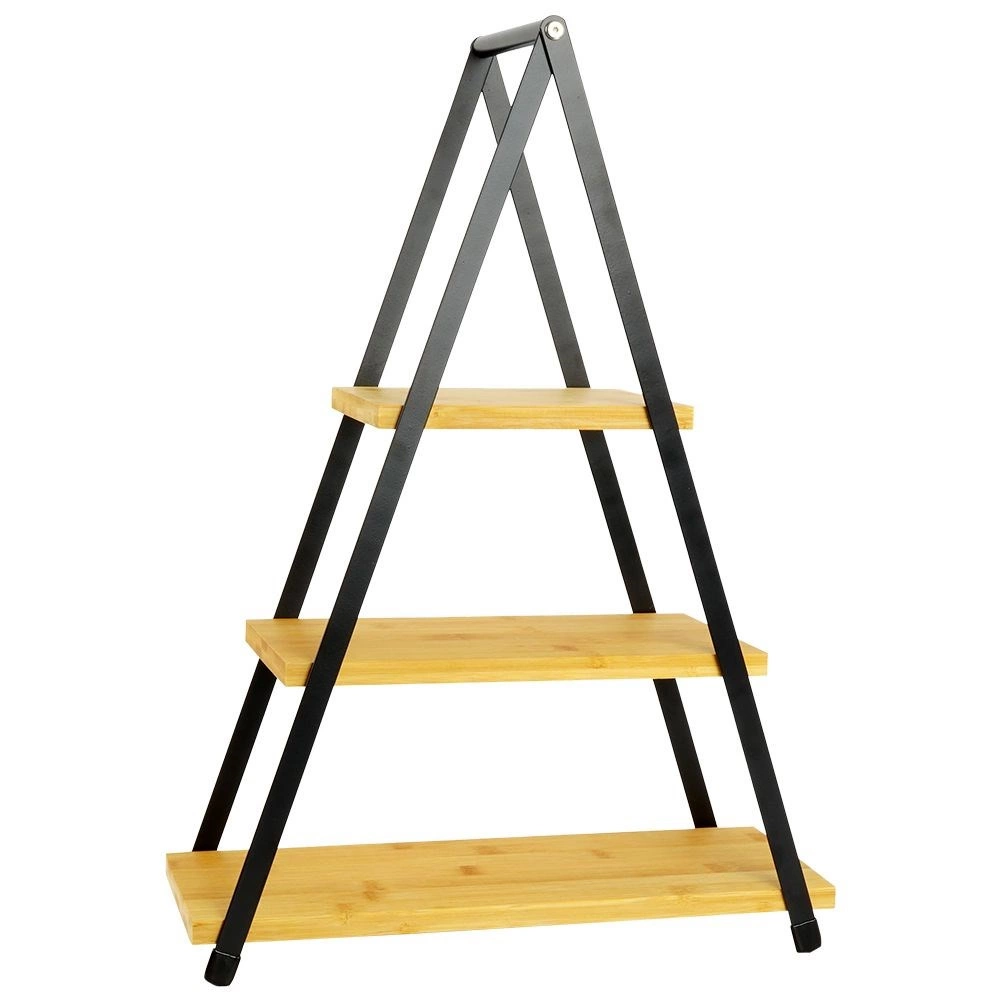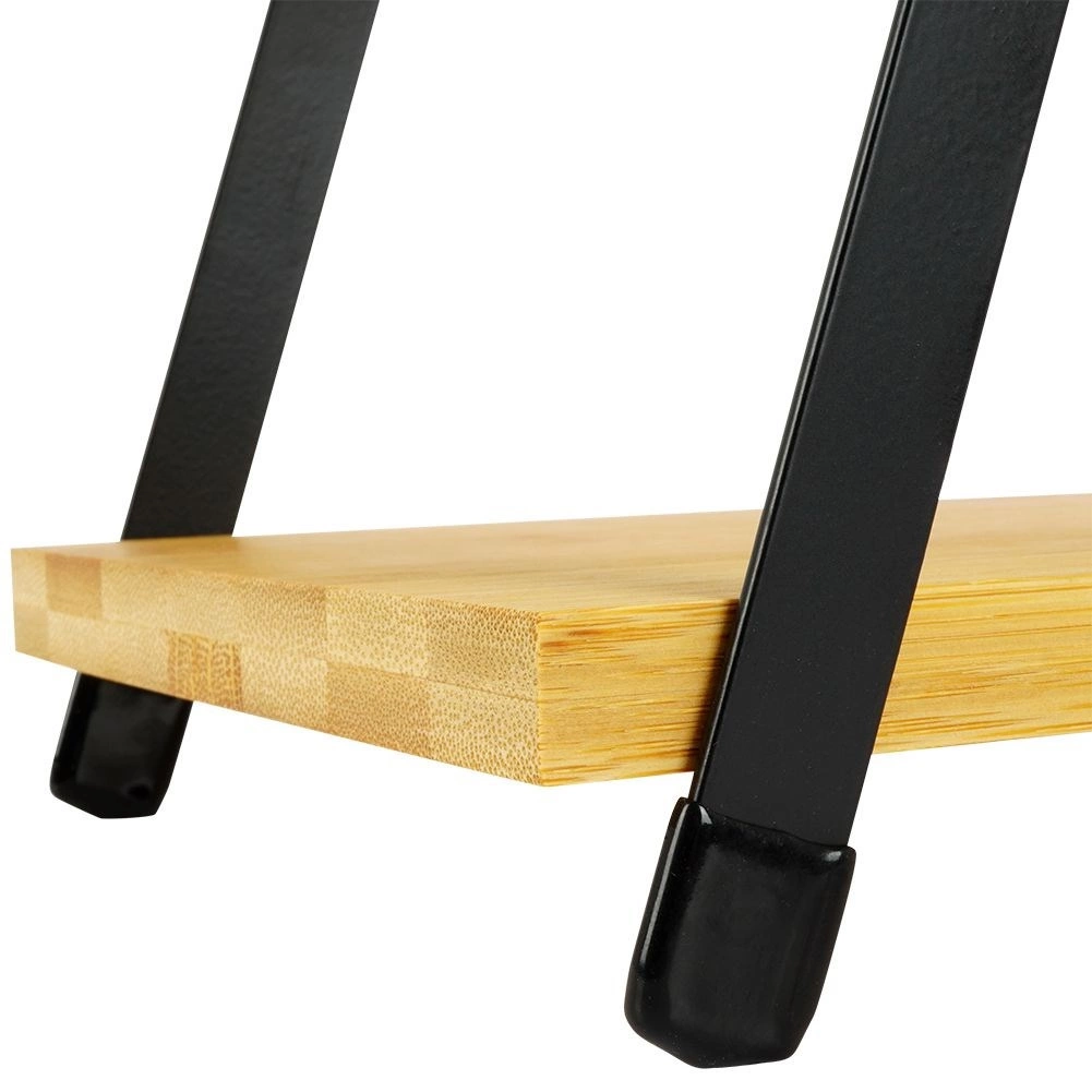 Ova stilska trokatna patera kombinira prirodni bambus s robusnim crnim metalom za stabilnu i dekorativnu prezentaciju osvježenja. Savršena je za cupcakeove, kolačiće, mini deserte, ali i za pladnjeve sa sirom i suhomesnatim proizvodima te slane grickalice. Trokutasta A‑konstrukcija štedi prostor na stolu i ističe svaki stol.